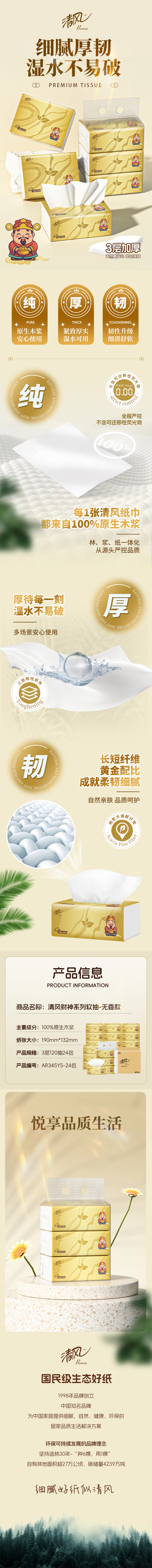 清风 AR34SYS-8T 3层120抽24包 压花抽纸 金色(单位:箱)