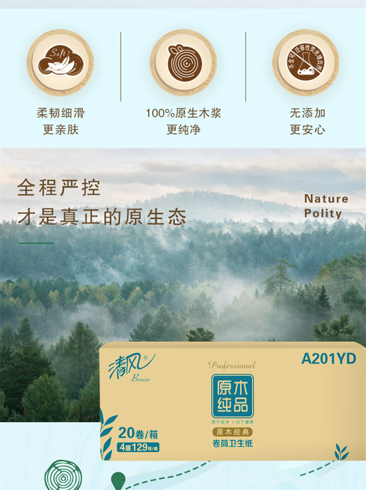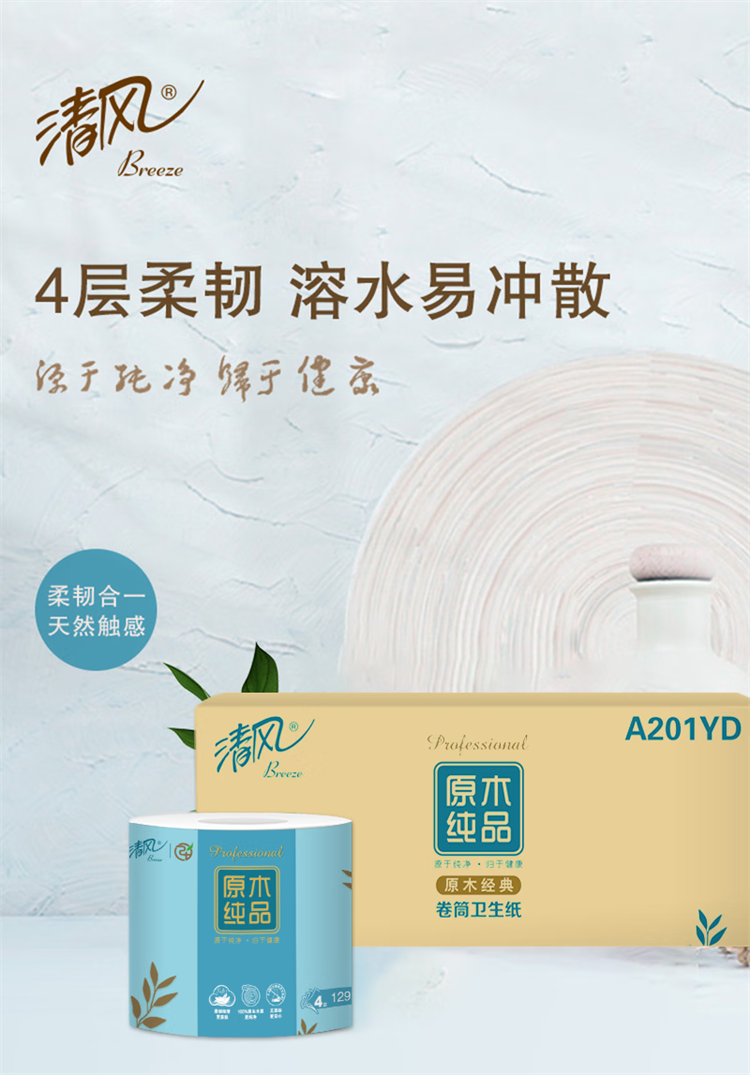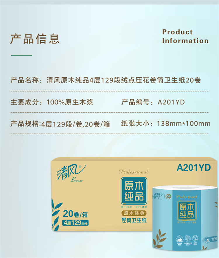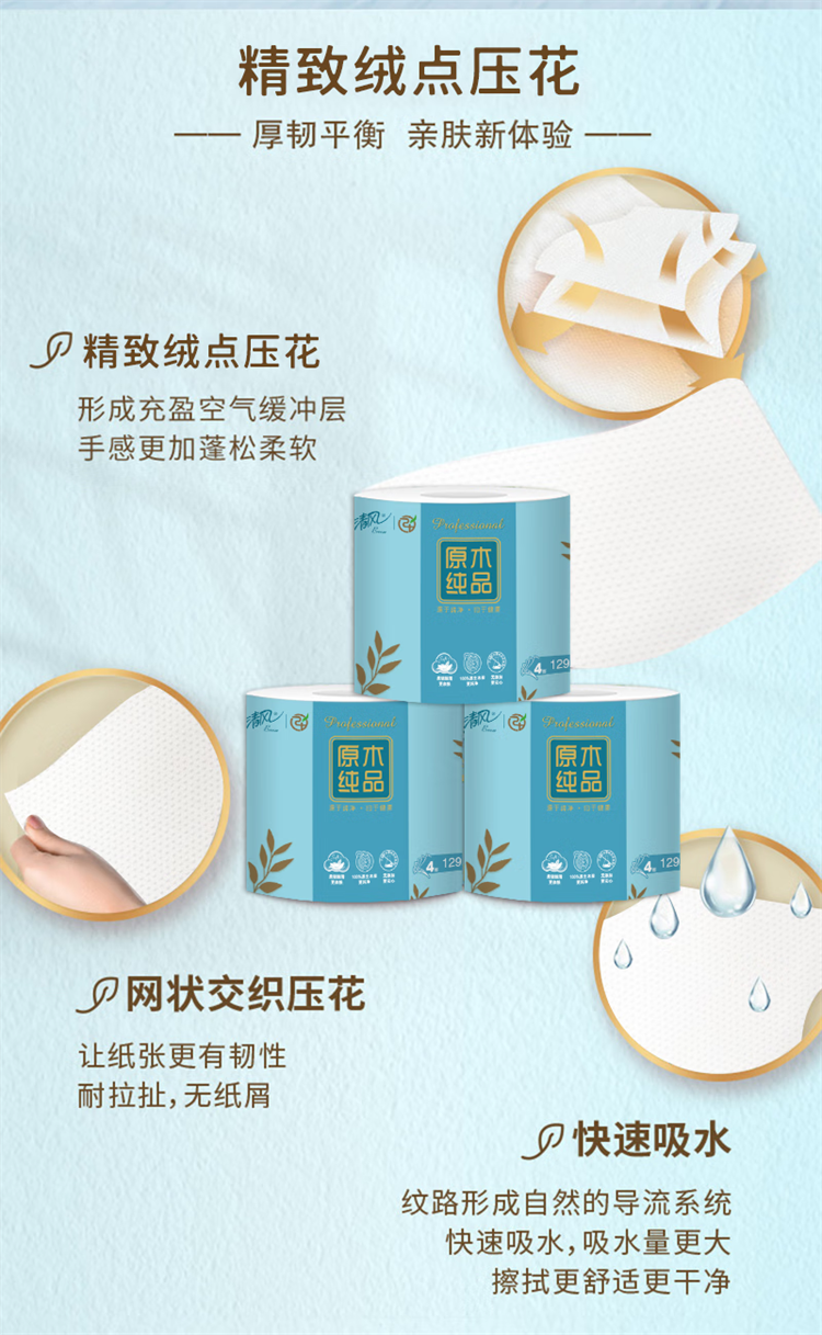 清风 原木纯品4层129段绒点压花卷筒卫生纸 A201YD 20卷 天蓝色(单位:箱)