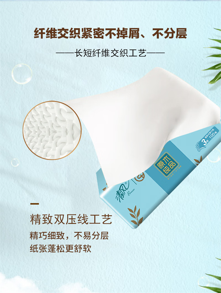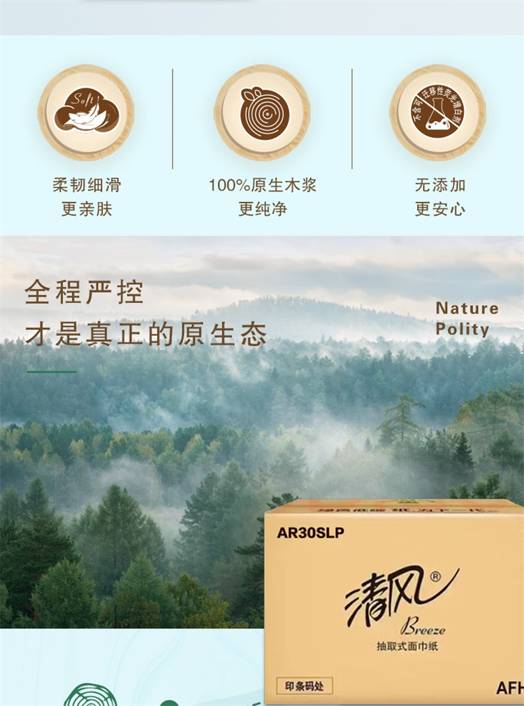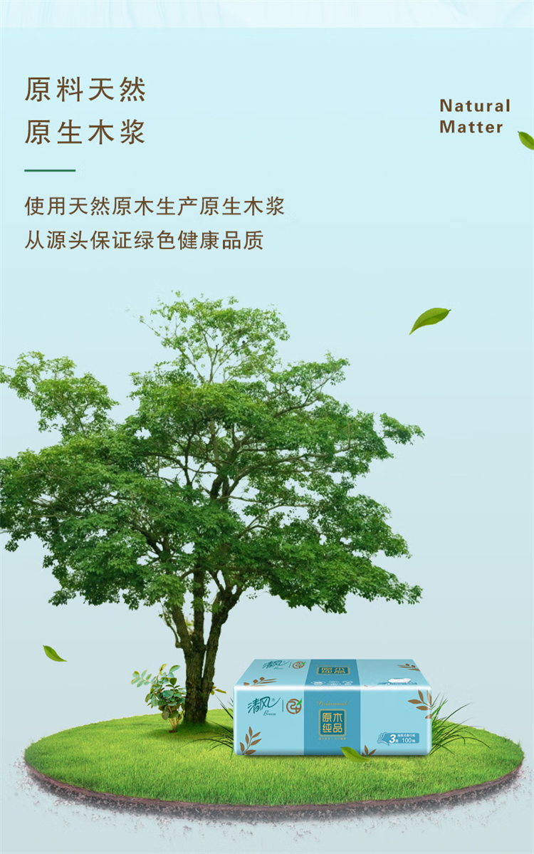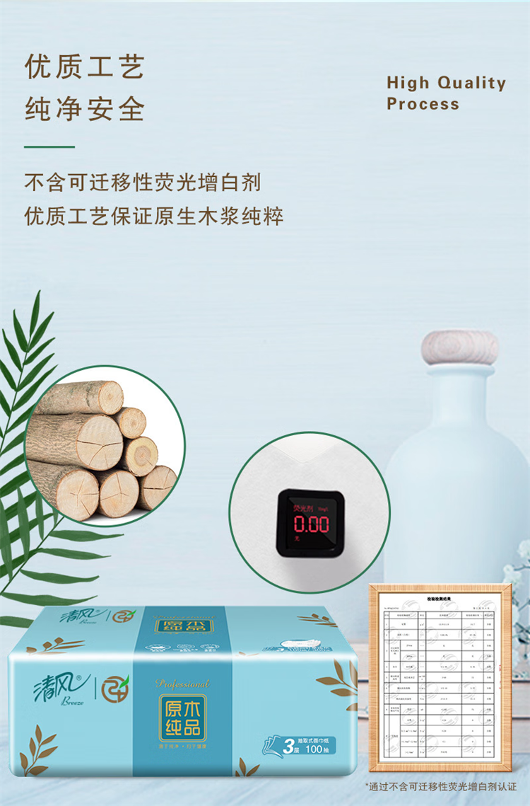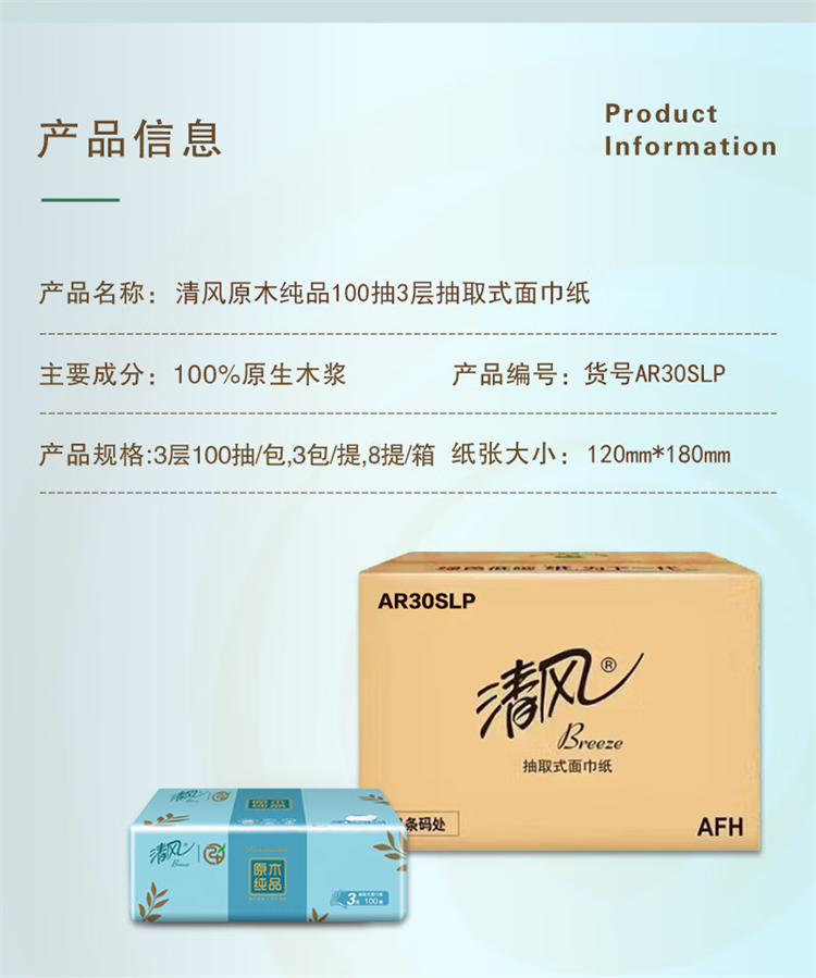 清风 原木纯品抽取式面巾纸 AP30SLP 3层100抽24包抽整箱 水蓝色(单位:箱)