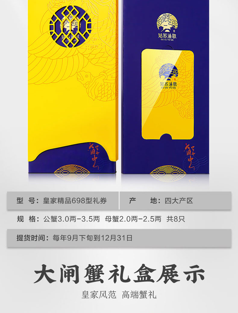 姑苏渔歌 苏州大闸蟹中秋送礼【卡券】 皇家精品698型 公蟹3.0两-3.5两4只+母蟹2.0两-2.5两4只 鹅仔黄(单位:张)