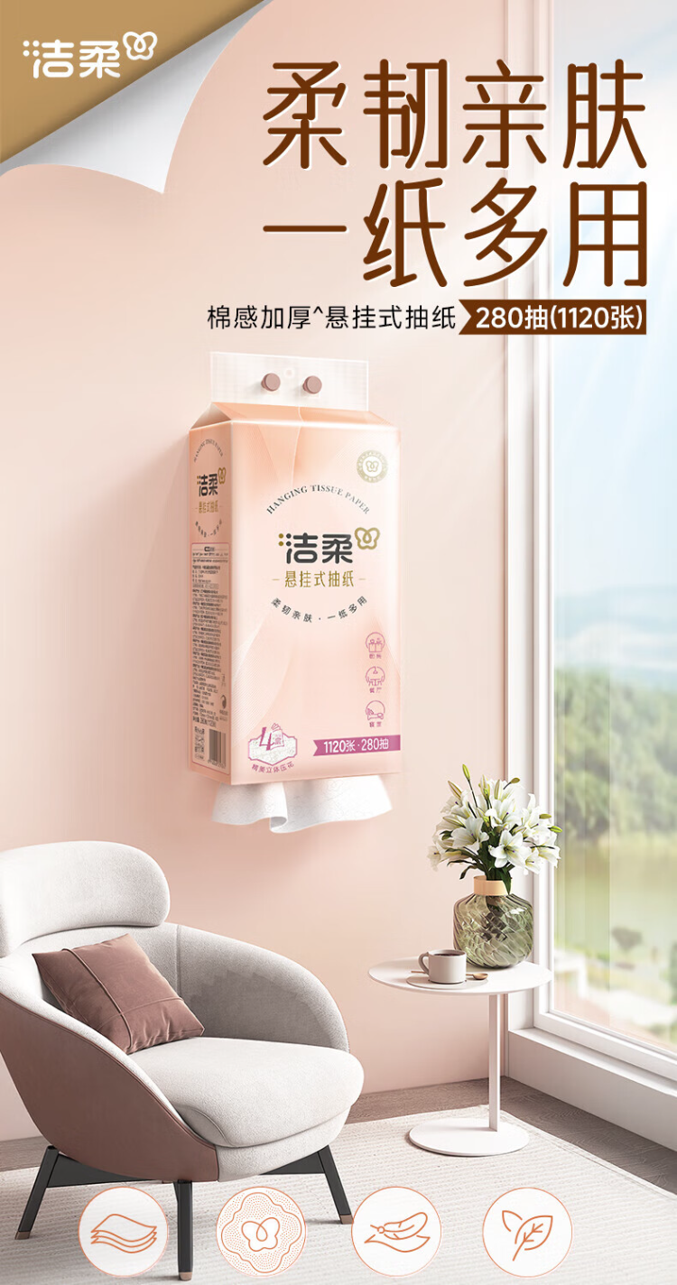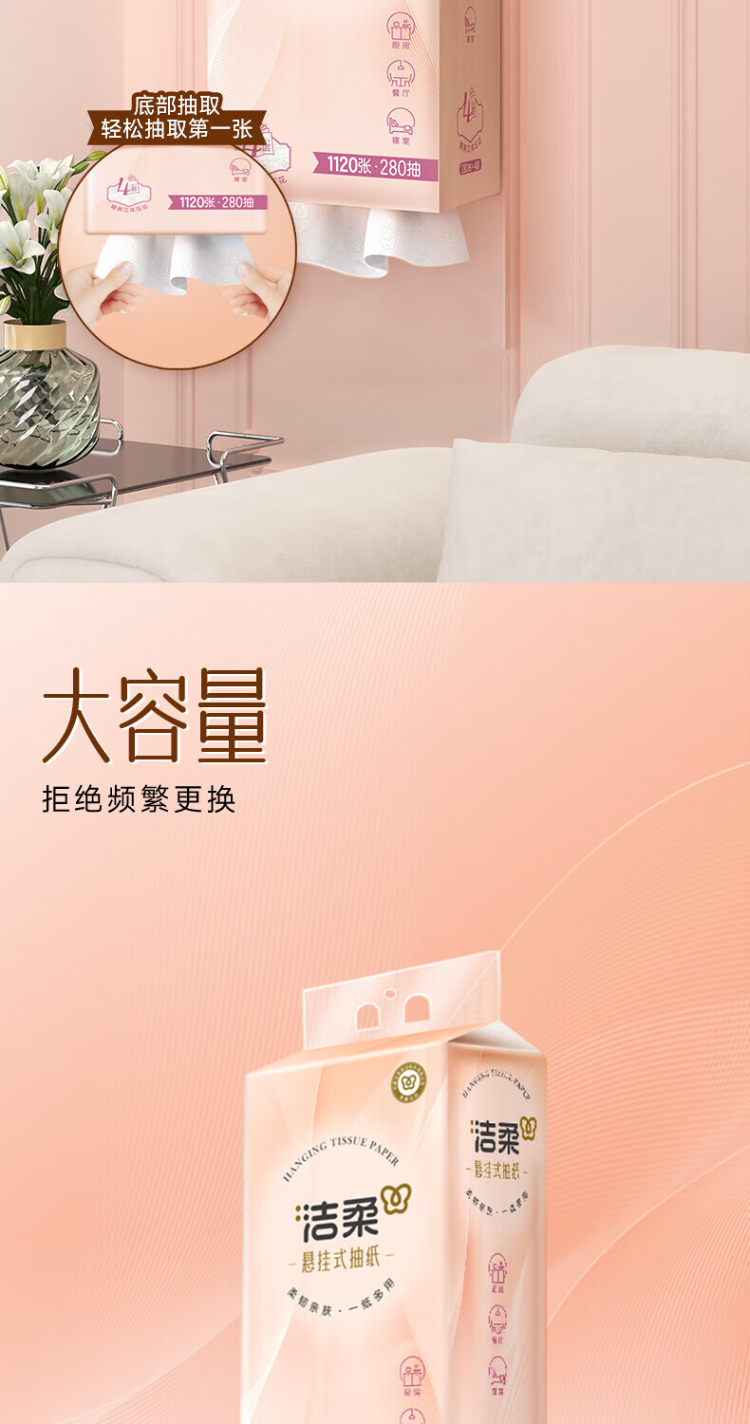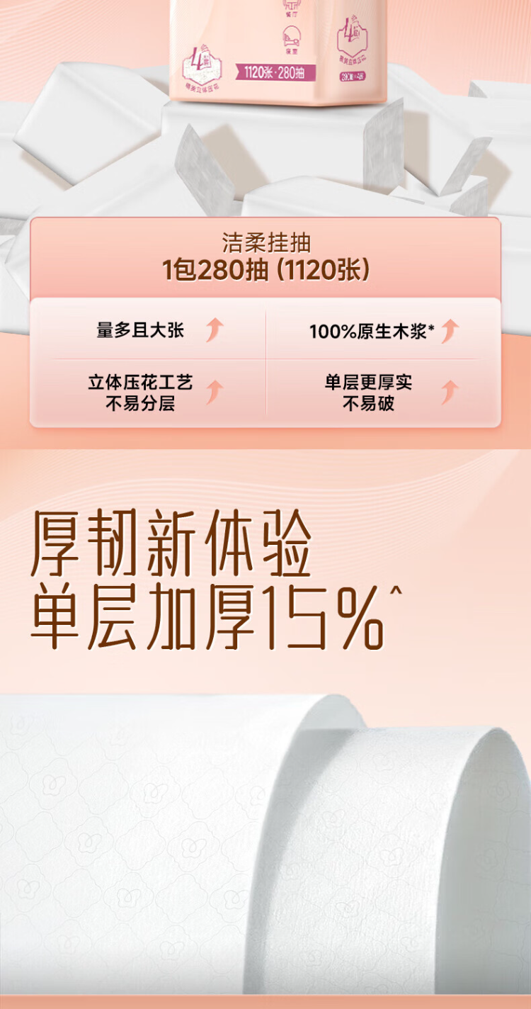 洁柔(C&S) 立体压花挂抽抽纸 GR227 4层280抽1提 粉色(单位:提)