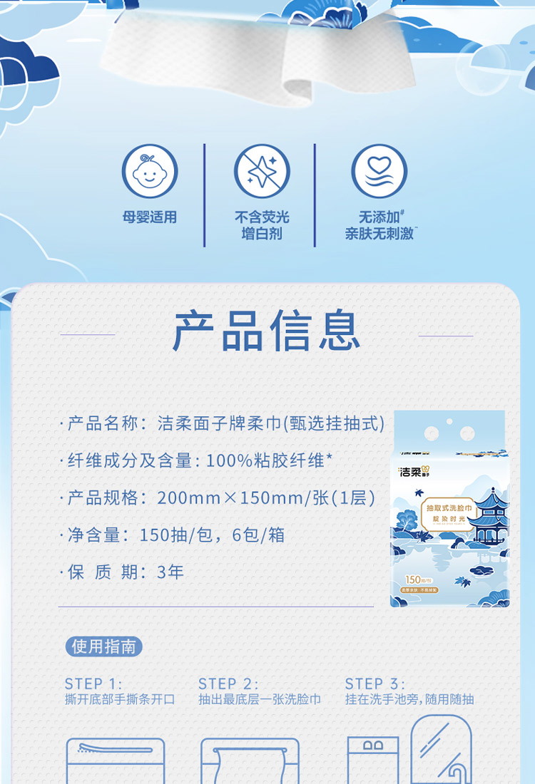 洁柔(C&S) 甄选挂抽式洗脸巾 TA002201A 150抽/包 白色(单位:包)