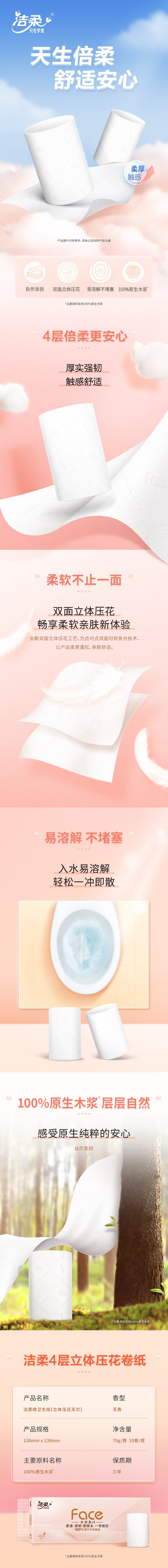 洁柔(C&S) 无芯卷纸 TW001801A 70克4层(10卷装) 粉色(单位:提)
