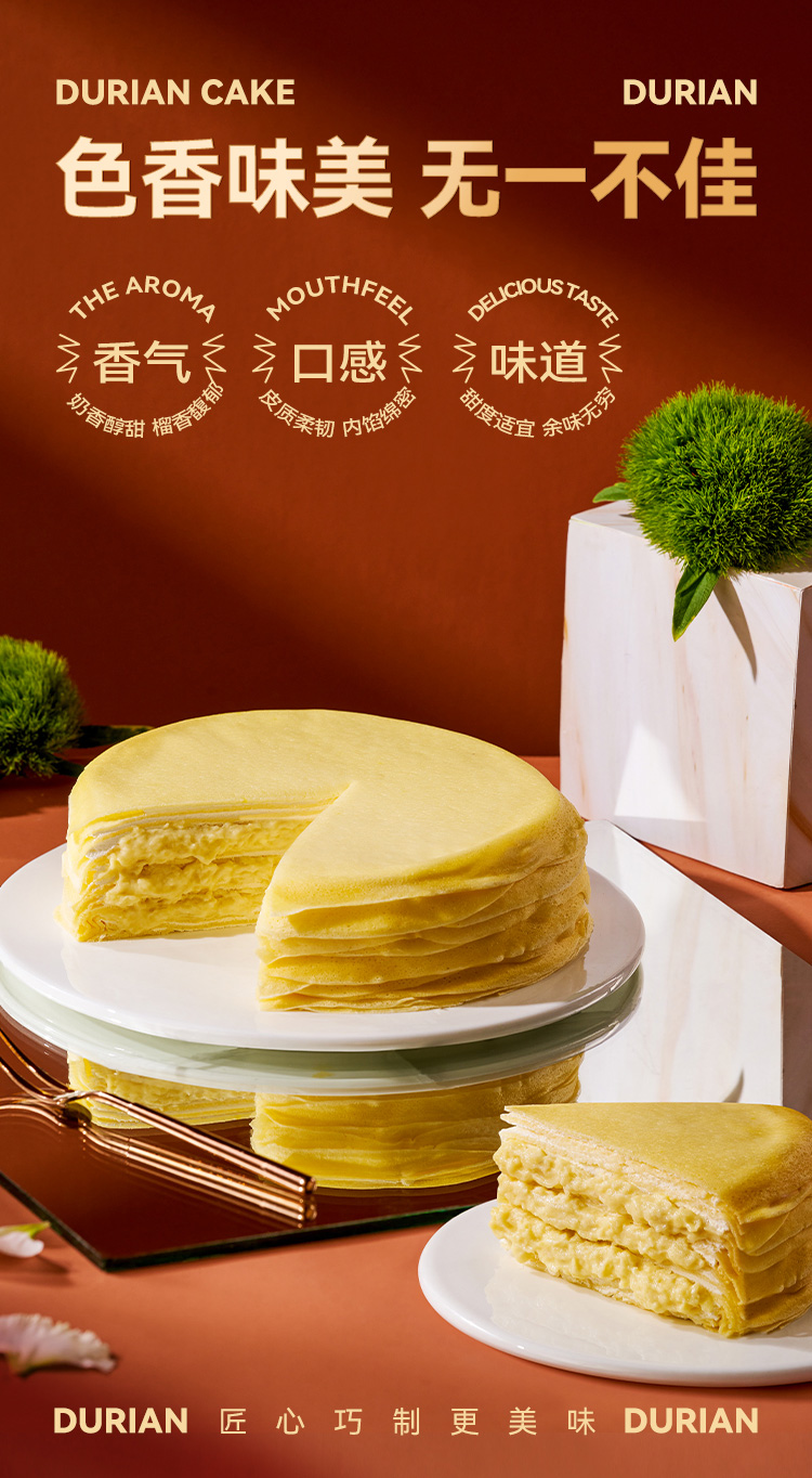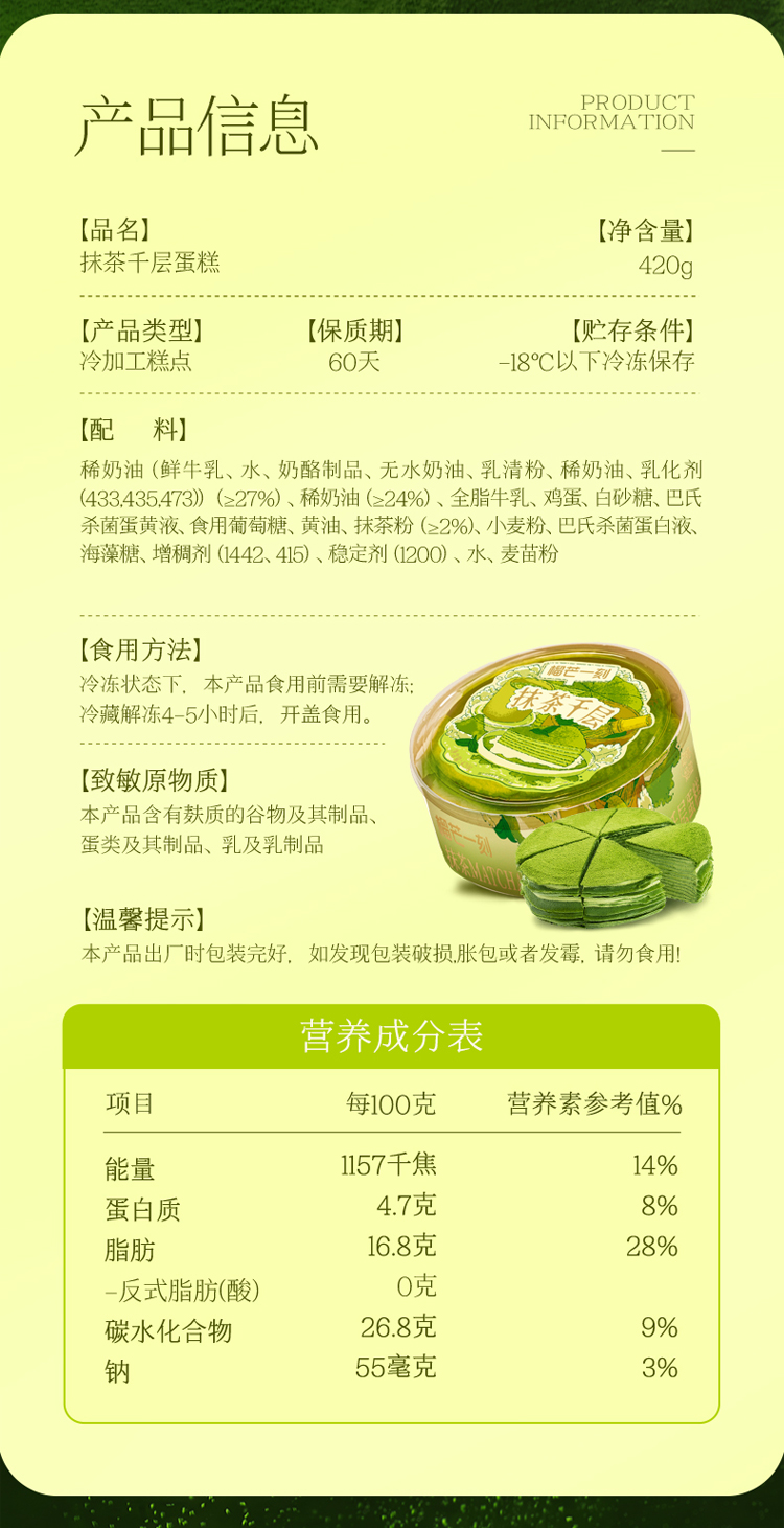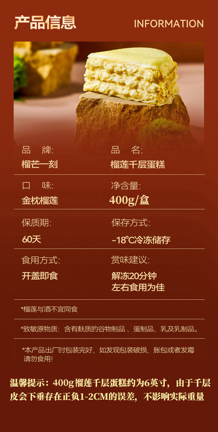 榴芒一刻 蛋糕甜点 下午茶 榴莲千层400g*1盒+抹茶千层420g*1盒 混色(单位:组)