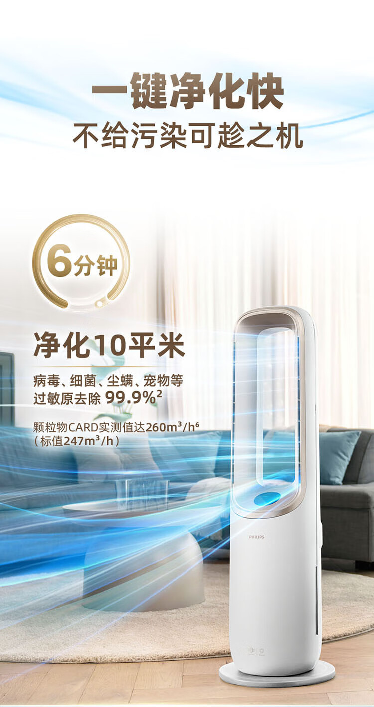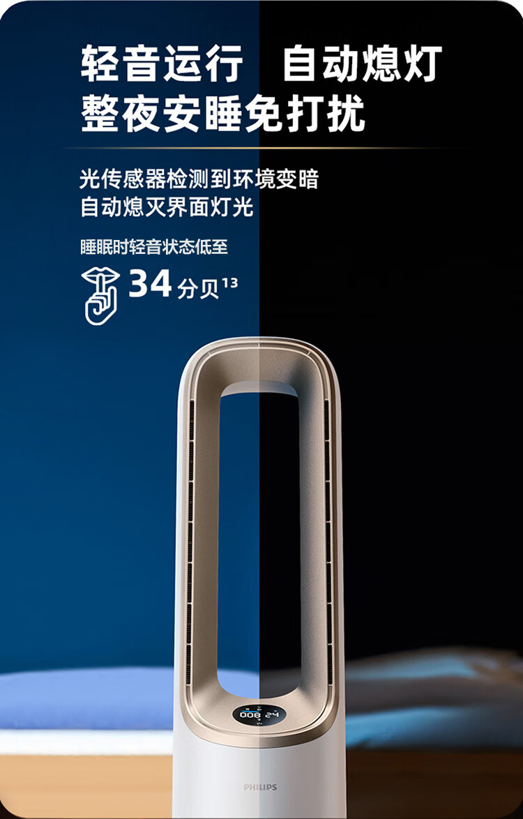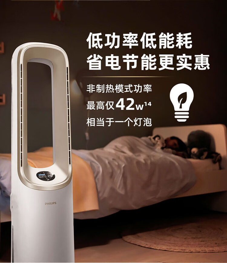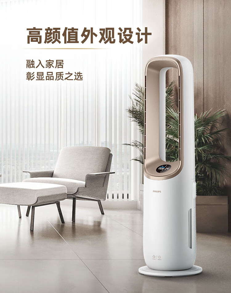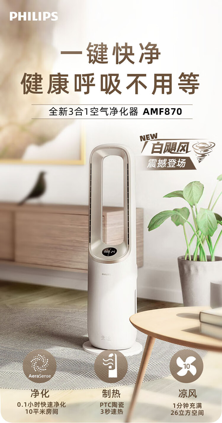 飞利浦(PHILIPS)净化凉风暖风三合一智能空气净化器AMF870/06取暖器电风扇家用除烟味除甲醛轻音智能无叶风扇(单位:台) 白色