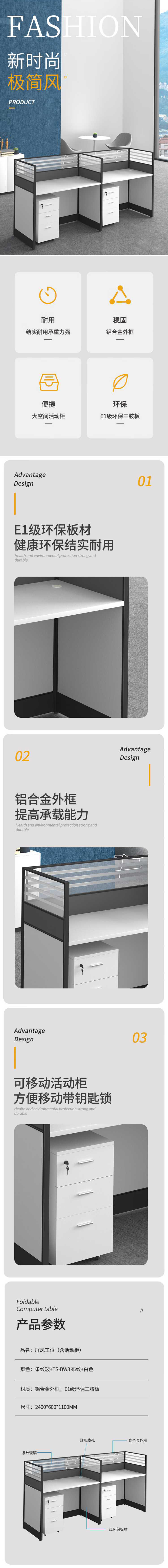 企诺 屏风工位员工职员桌直形双人位 QM005 2400*600*1100mm 灰色(单位:组)