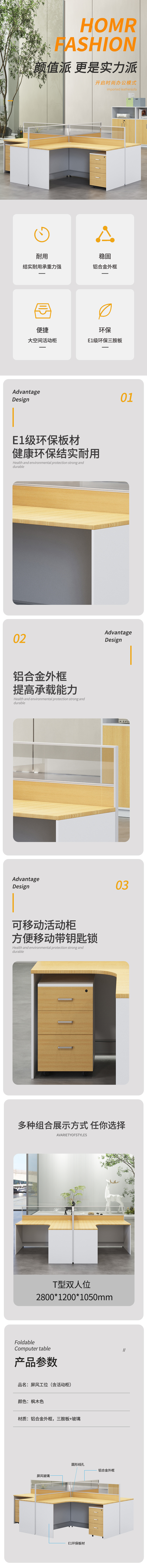 企诺 屏风办公桌职员电脑桌T型双人位 QM023 2800*1200*1050mm 枫木色(单位:组)