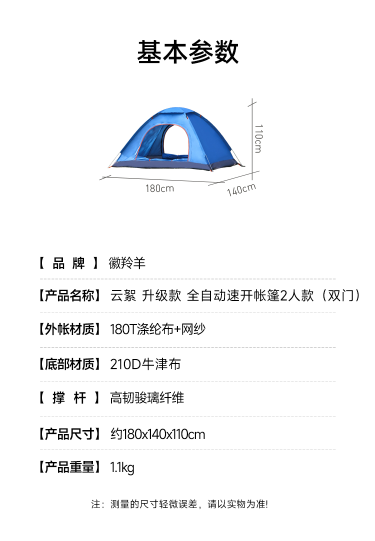 徽羚羊 云絮 升级款 全自动速开帐篷2人款(双门) HLY-ZP-24018 约180x140x110cm 1.1kg 蓝色(单位:个)
