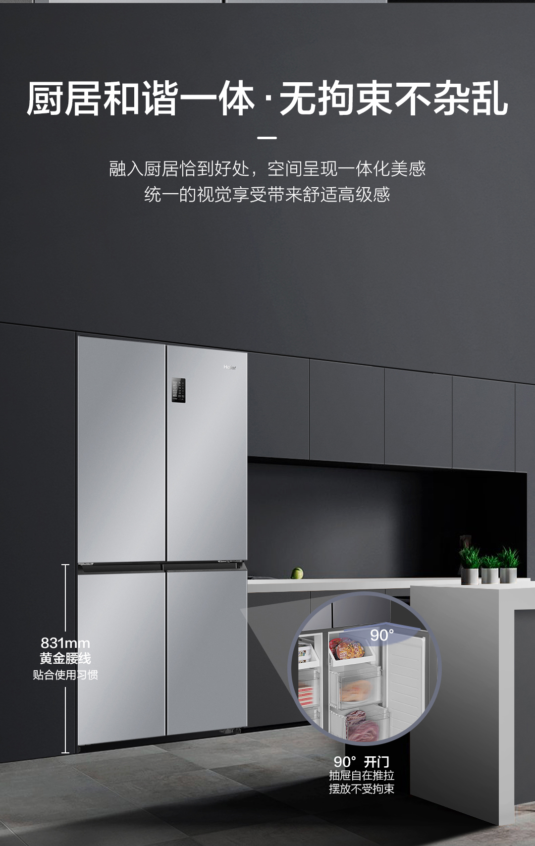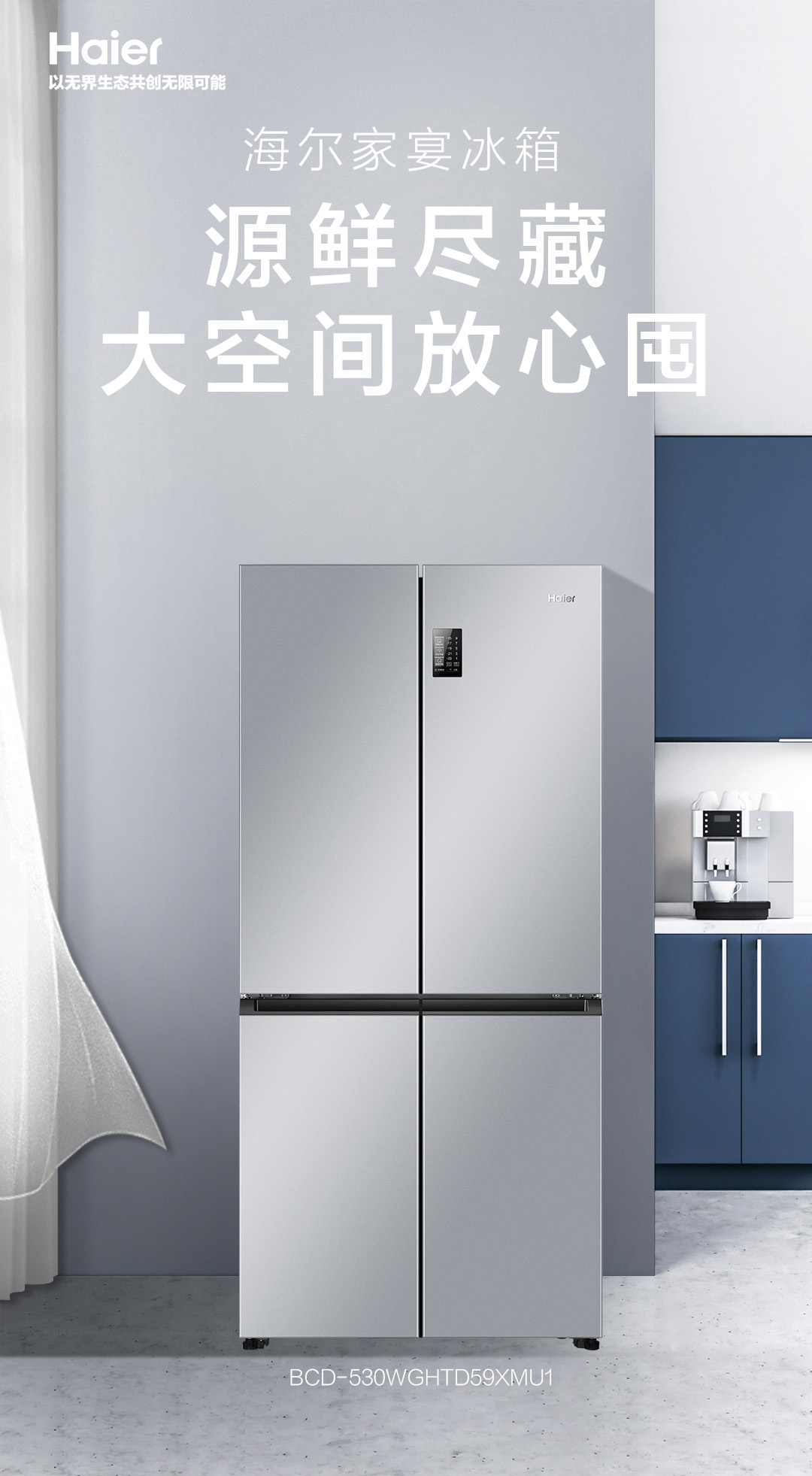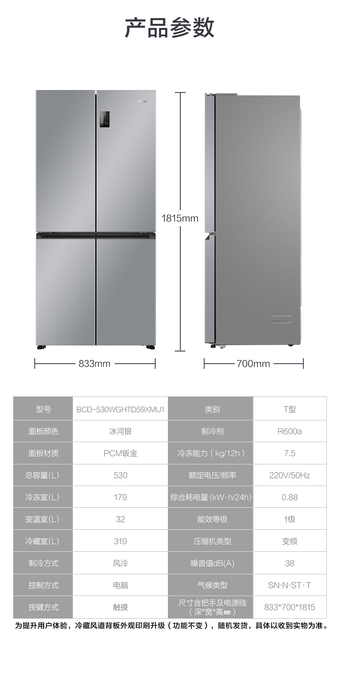 海尔(Haier) BCD-530WGHTD59XMU1 十字对开门四门530升风冷独嵌两用90度 银色