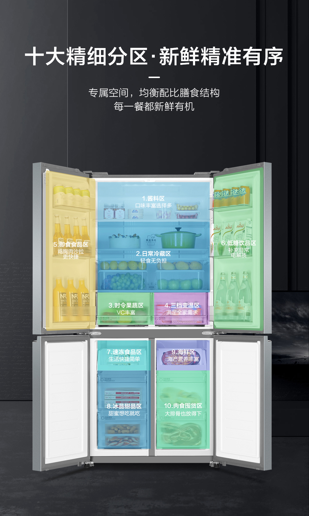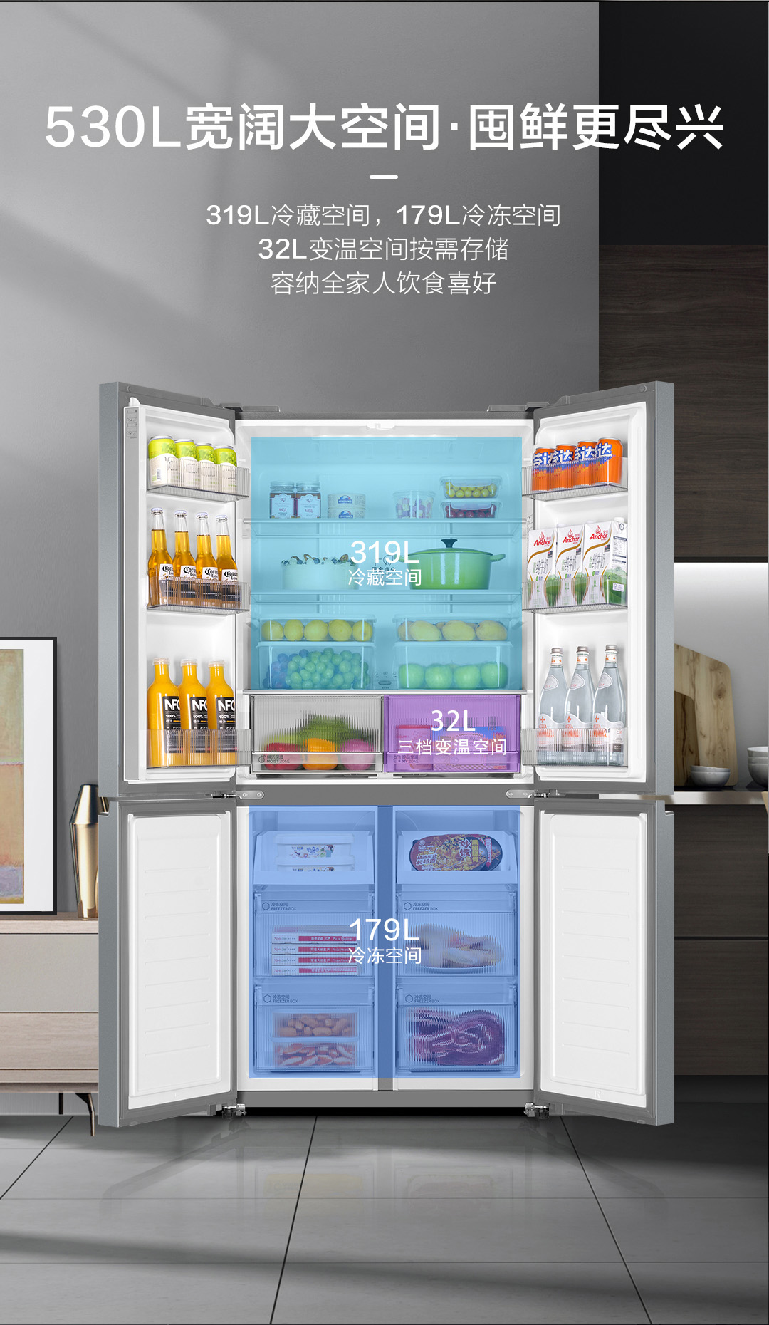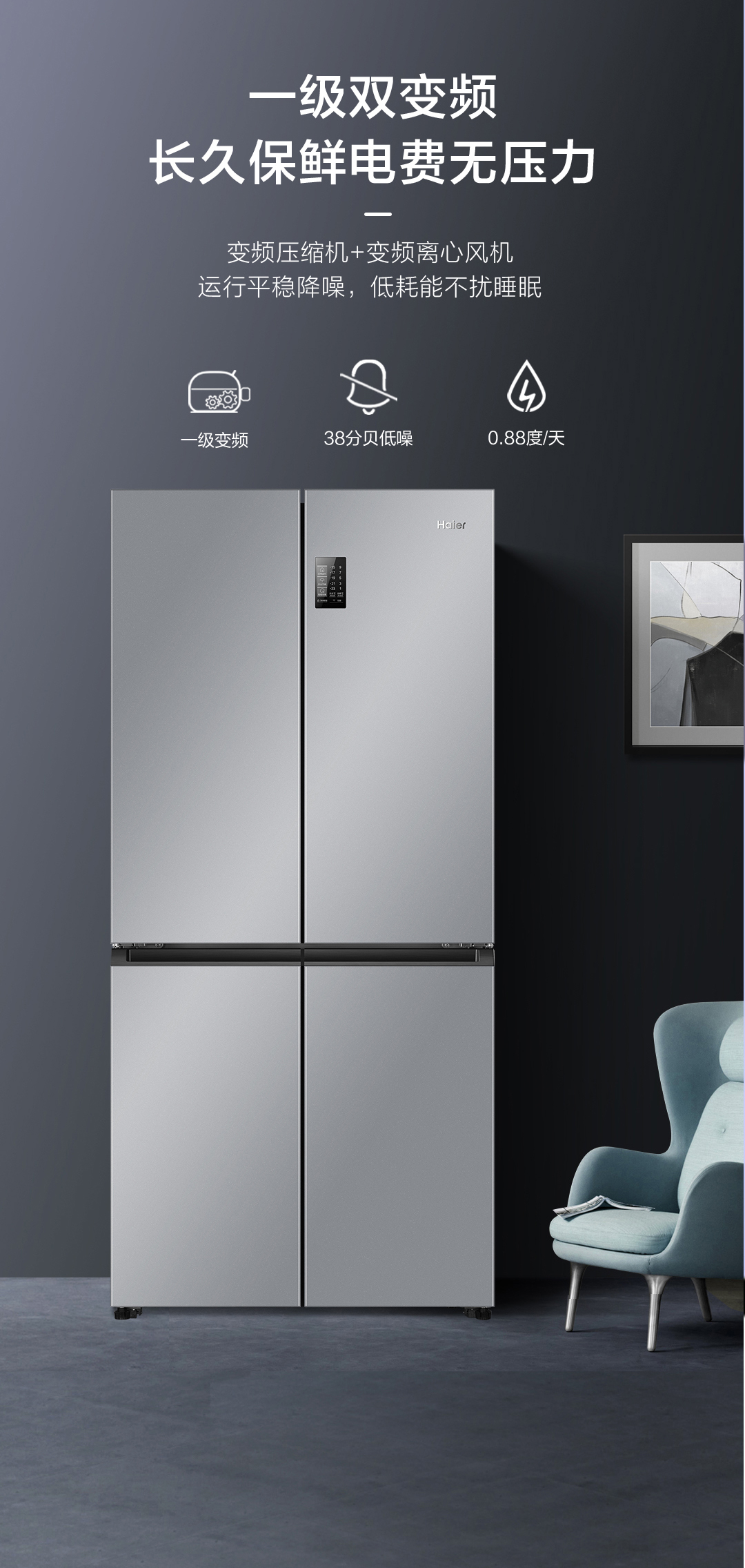 海尔(Haier) BCD-530WGHTD59XMU1 十字对开门四门530升风冷独嵌两用90度 银色