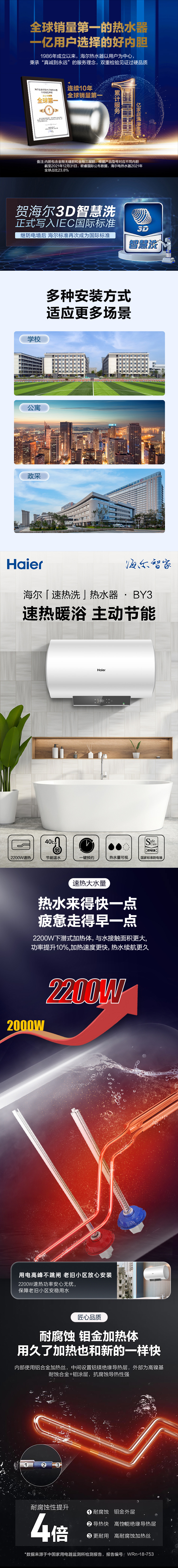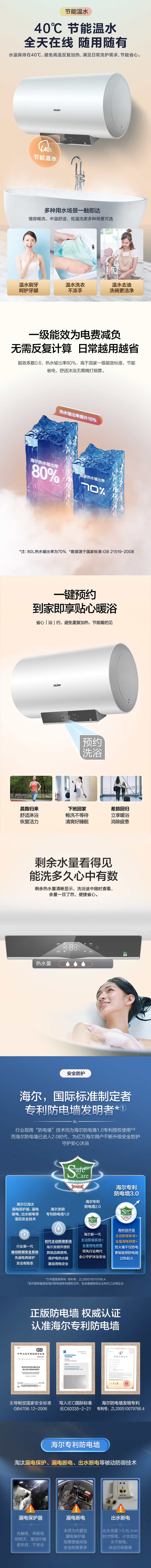 海尔(Haier) ES80H-BY3 安装自理,80升2200W 一级能效 储水式家用电热水器台 白色