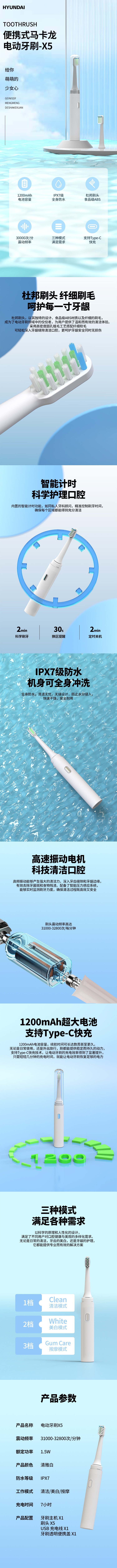 现代(HYUNDAI) 电动牙刷 X5 便携式马卡龙(配5个刷头) 白色(单位:支)