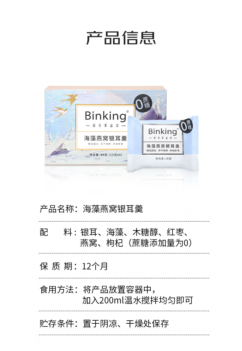 Binking 含玻璃杯1个 15g/袋*6袋/盒*9盒 燕窝银耳羹 无糖款 极光色(单位:组)