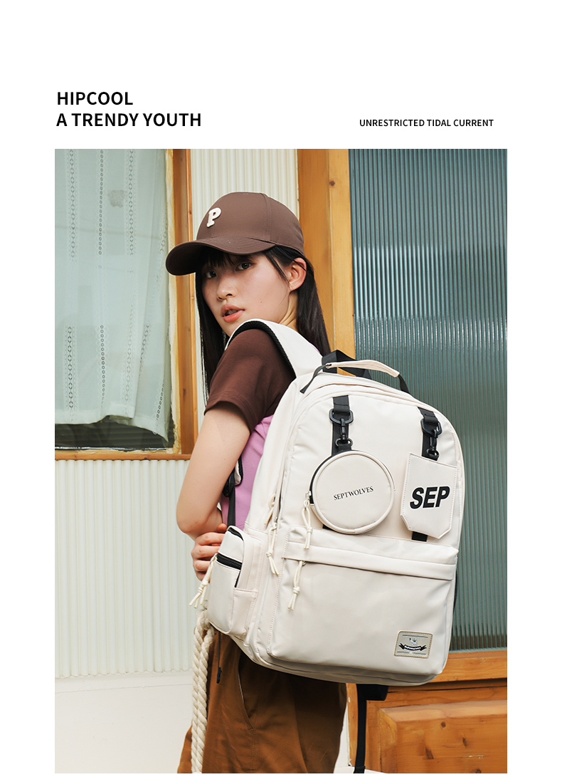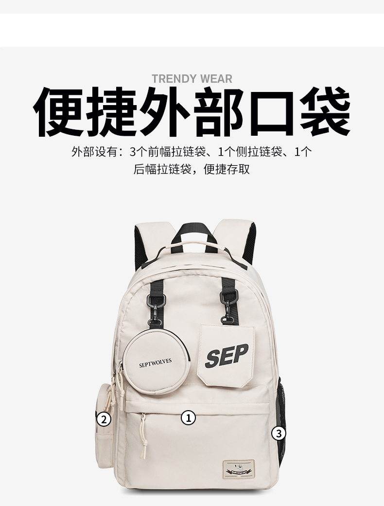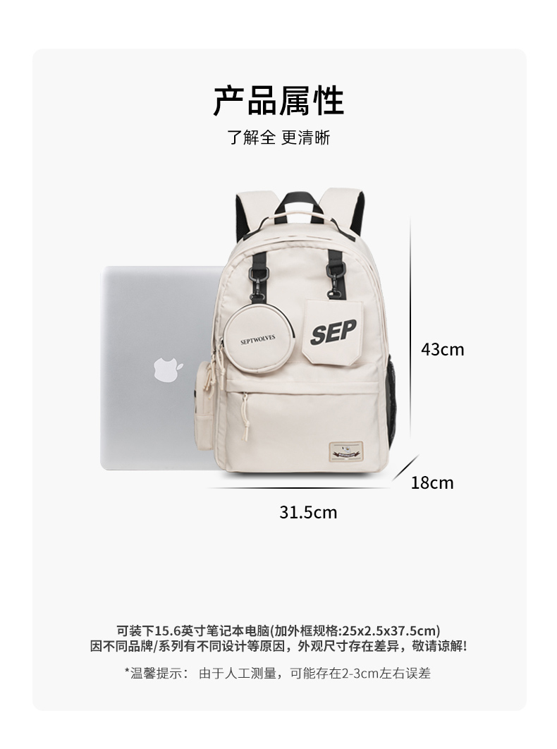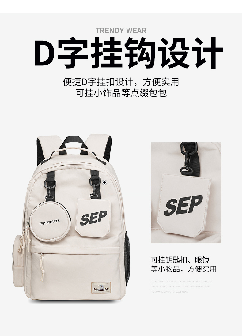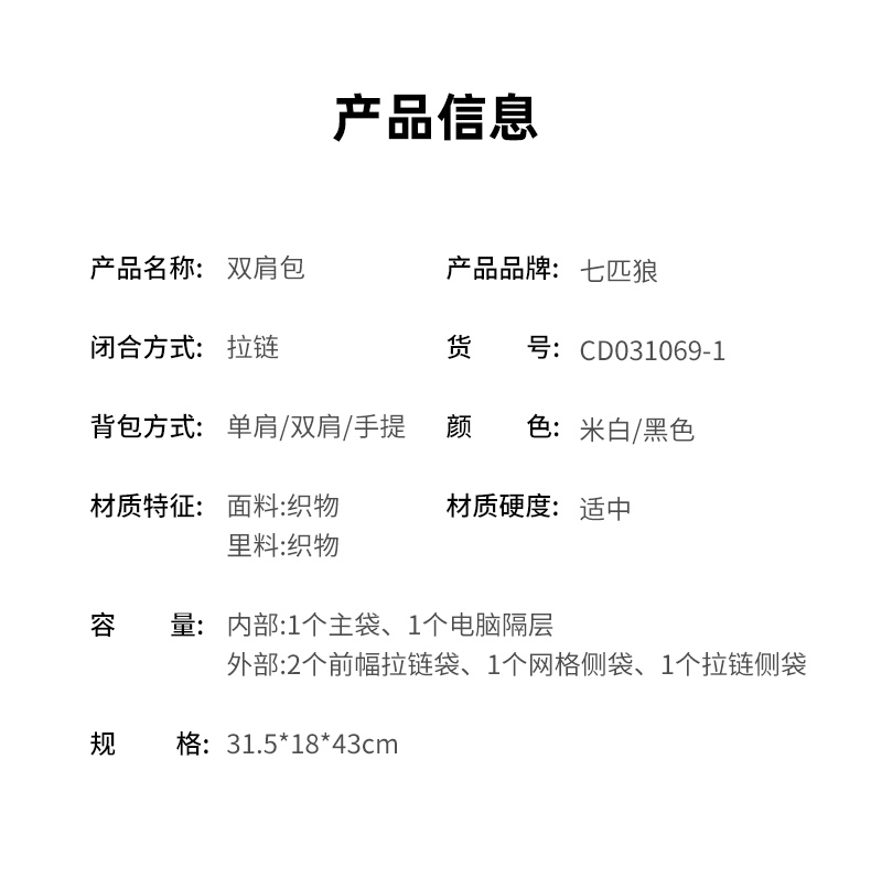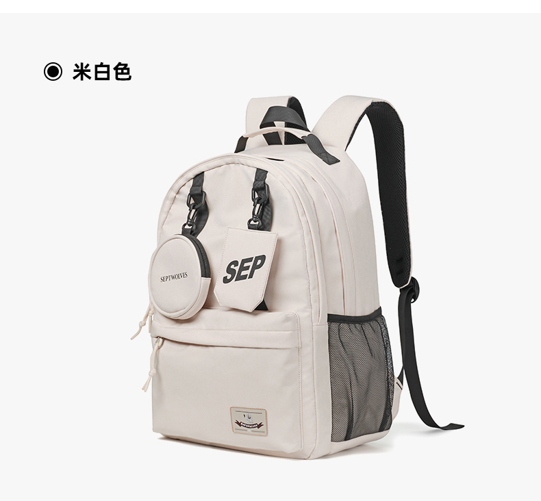 七匹狼(SEPTWOLVES) 双肩包女潮牌背包 CD031069-1 315x180x430mm 米白色(单位:个)