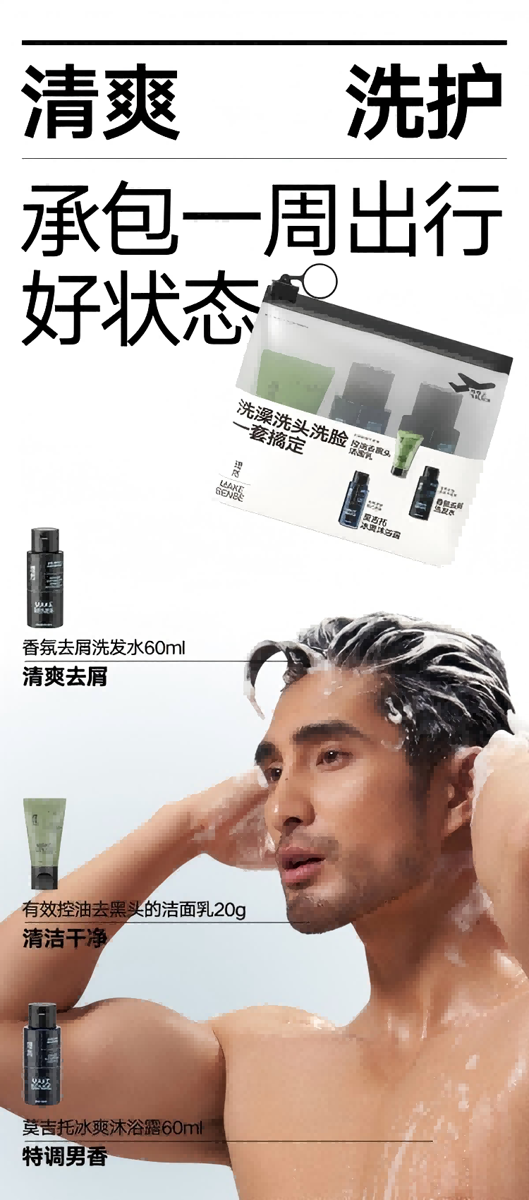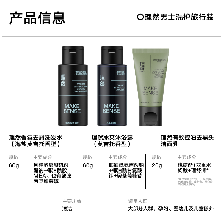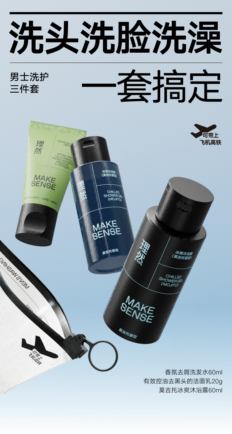 理然 便捷 男士洗护旅行装 洗发水60ml+沐浴露60ml+洁面乳20g 绿色(单位:套)