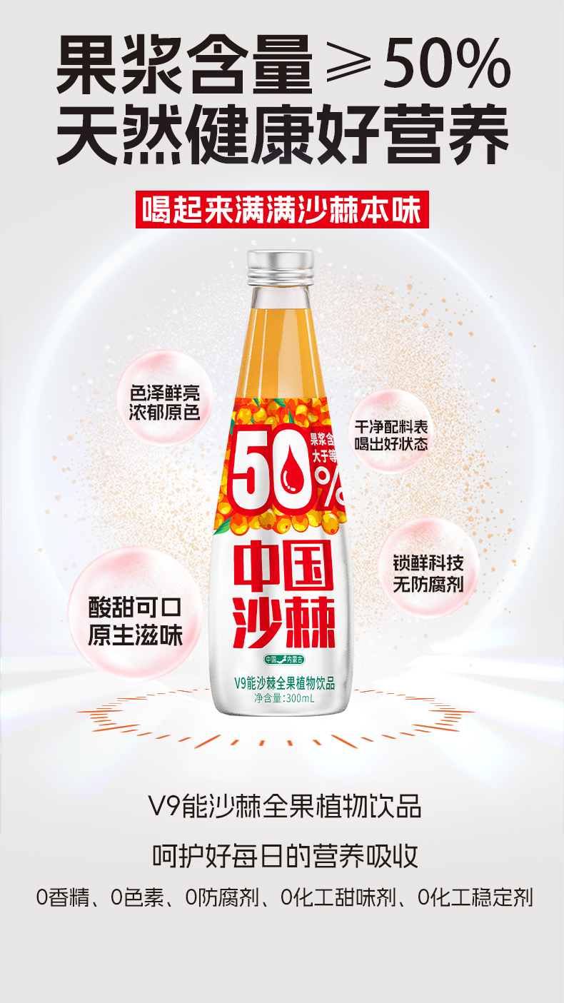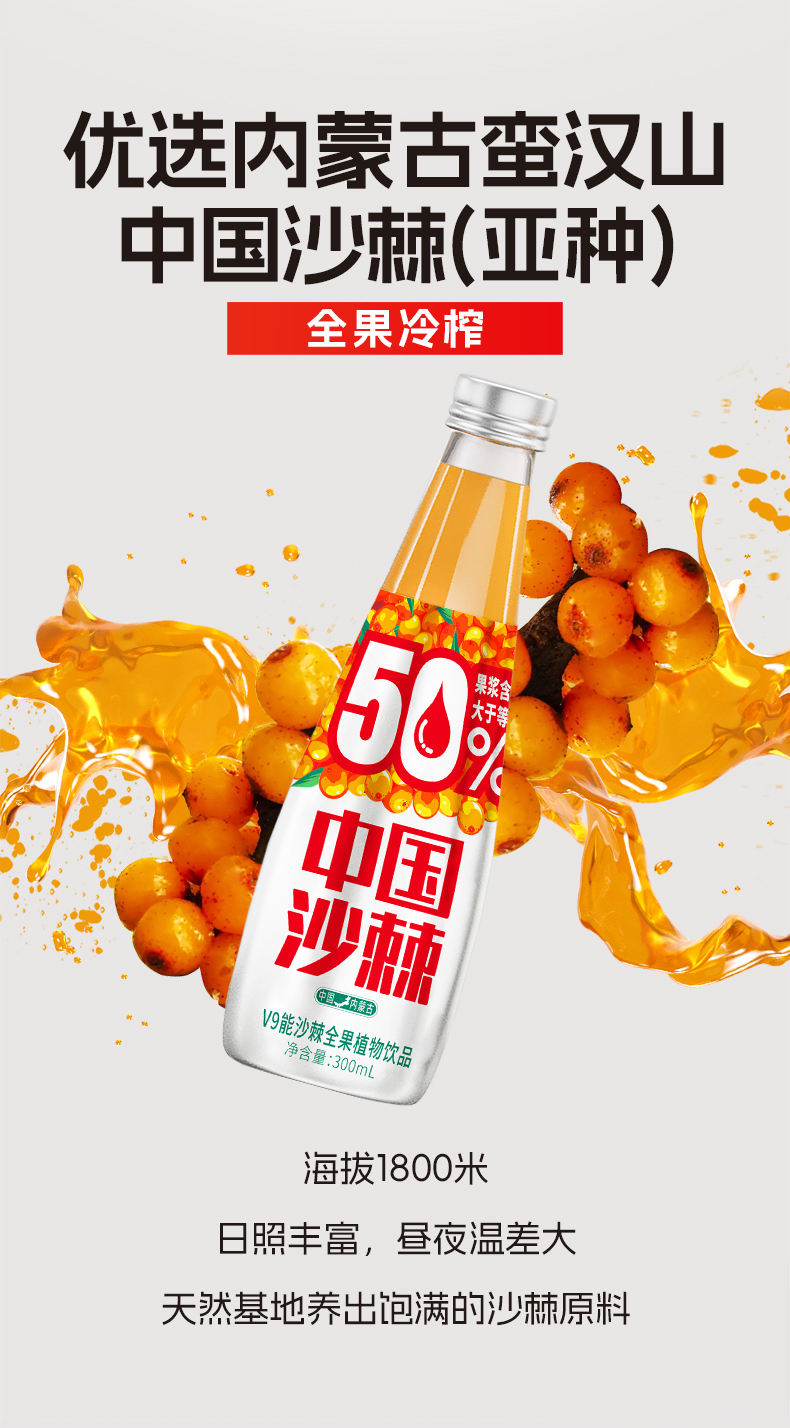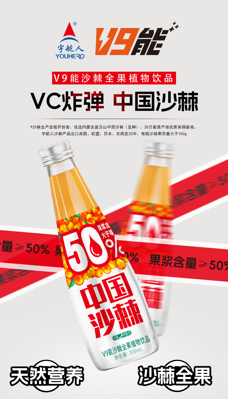 宇航人 V9能沙棘全果植物饮 300ml*6瓶/箱 酸甜可口新鲜榨取 橙色(单位:箱)