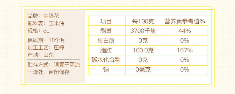 金银花 压榨一级食用油 玉米油 5L*1桶 混色(单位:桶)