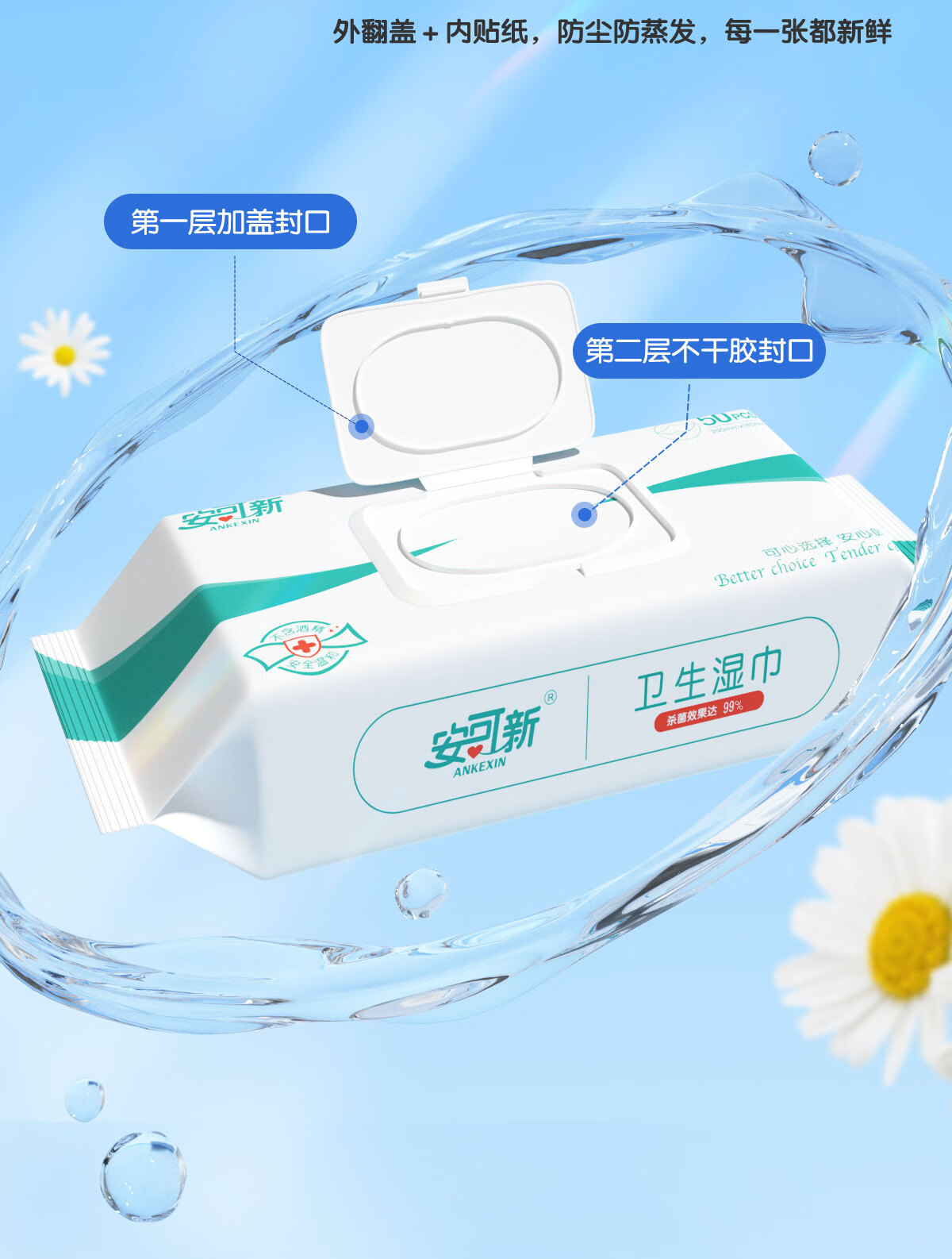 安可新 无酒精卫生湿纸巾双层锁水杀菌率99% AKX-4970-10 50抽*10包 白色(单位:组)