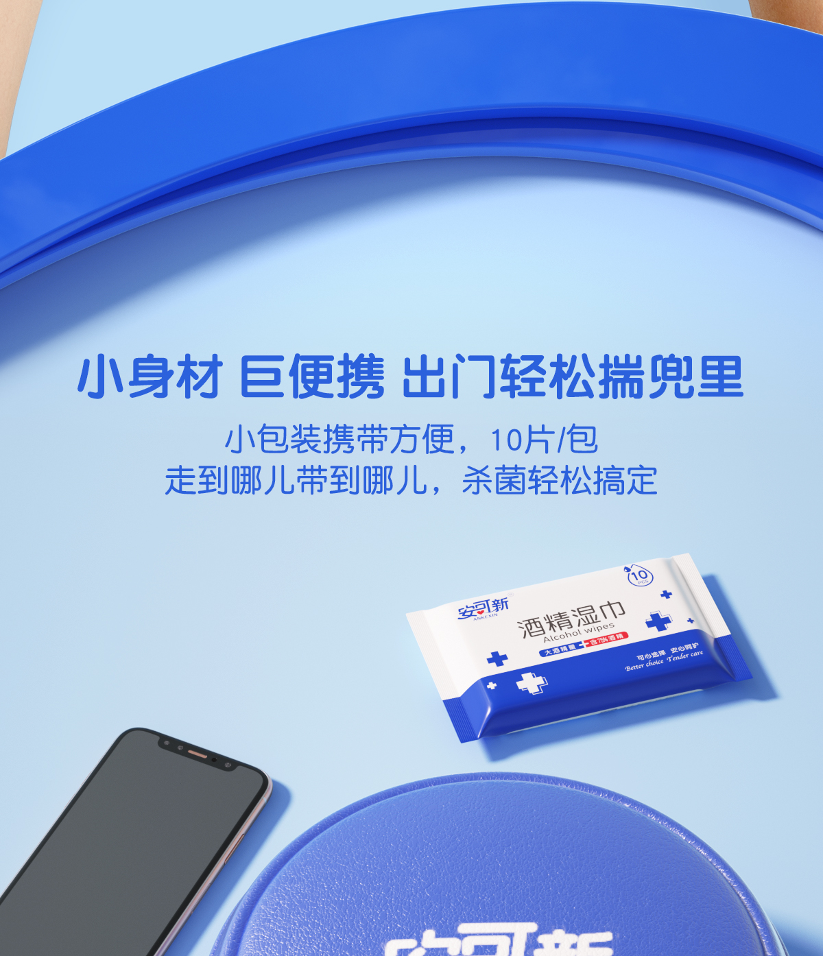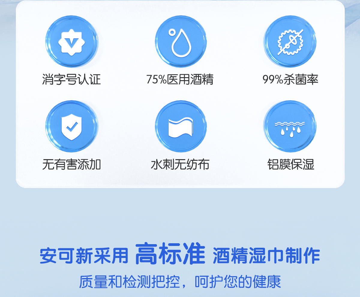 安可新 75%酒精消毒小包便携学生专用杀菌率99.9%湿巾纸 AKX-7765-40 10片*40 蓝色(单位:组)