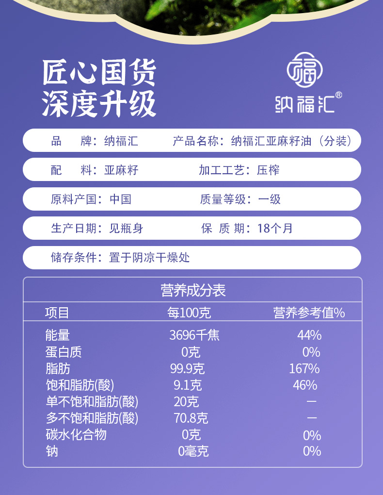 纳福汇 冷榨一级亚麻籽油 G-22 750ml*2 紫色(单位:盒)