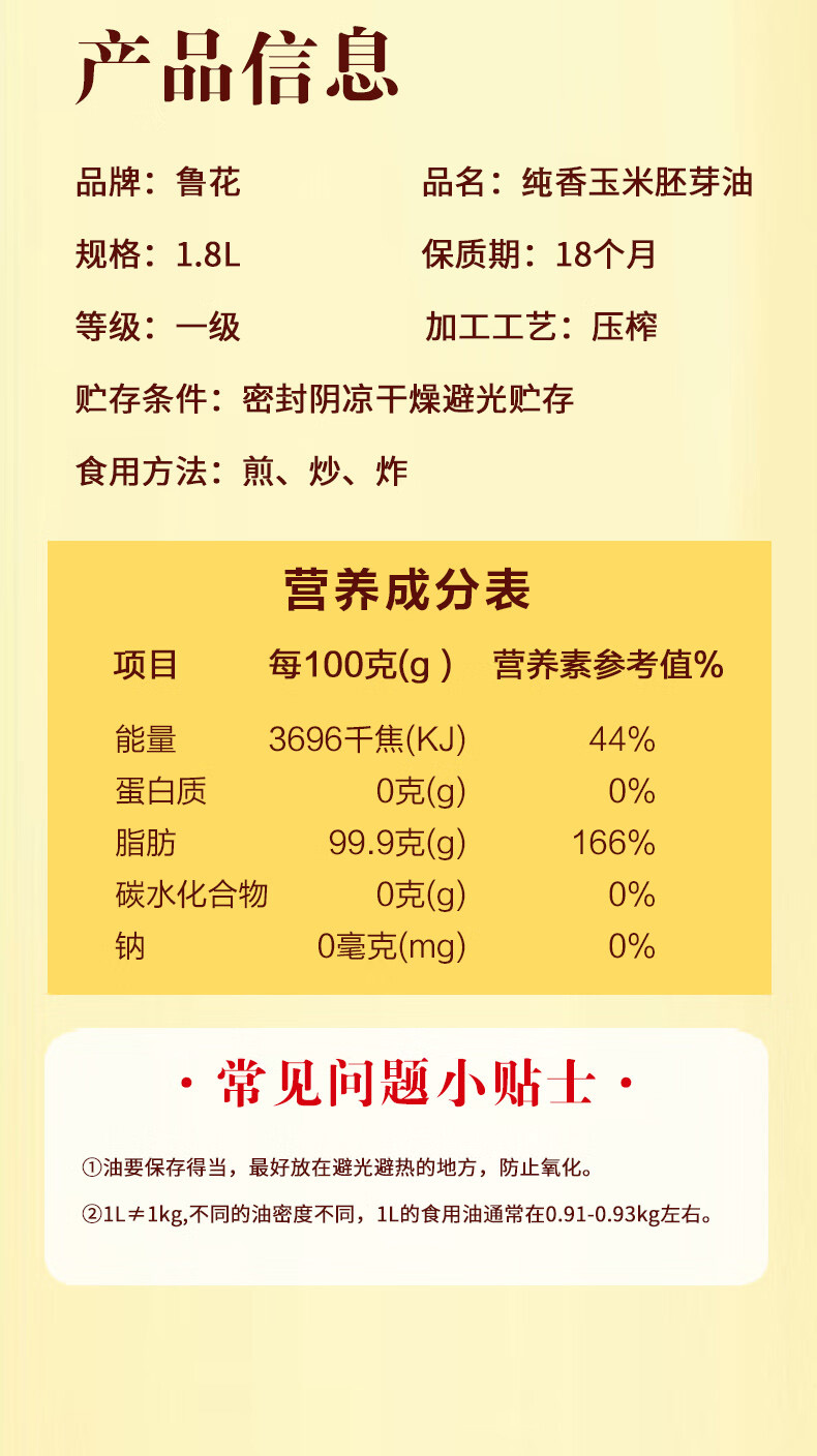 鲁花 厨中香 玉米油 1.8L 黄色(单位:瓶)