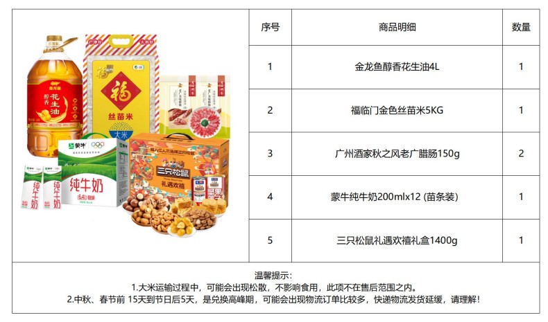 金龙鱼 /福临门/广州酒家/三只松鼠/蒙牛 粮油食品组合 6.7KG+6.4L 混色(单位:套)