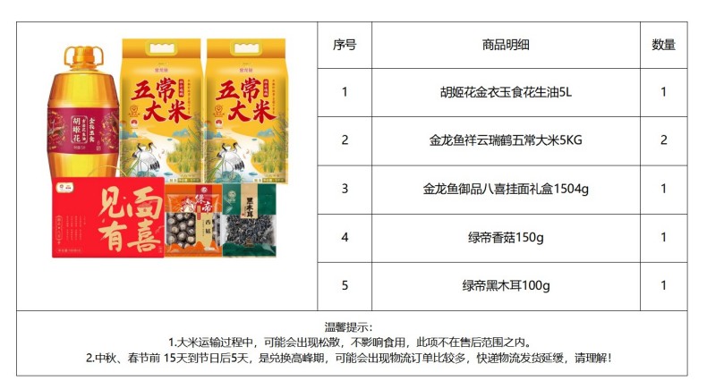 胡姬花 /金龙鱼/绿帝 粮油干货组合 11.754KG+5L 混色(单位:套)