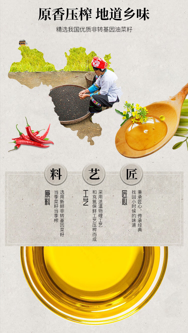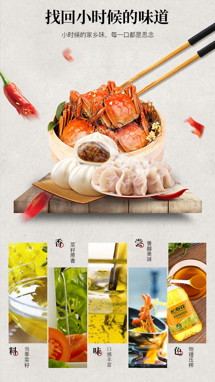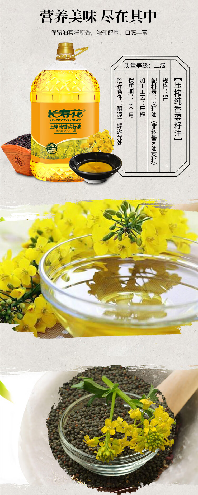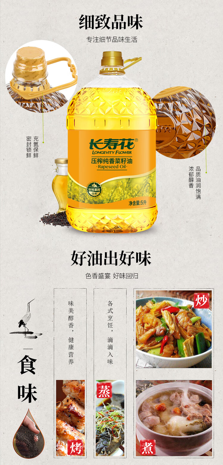 长寿花 压榨食用油植物油 纯香菜籽油 5L 黄色(单位:桶)