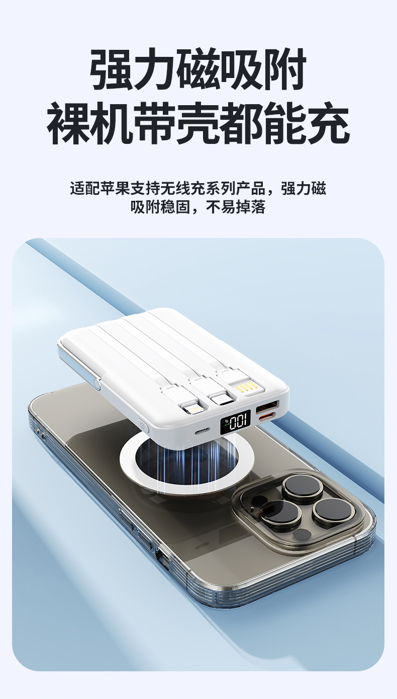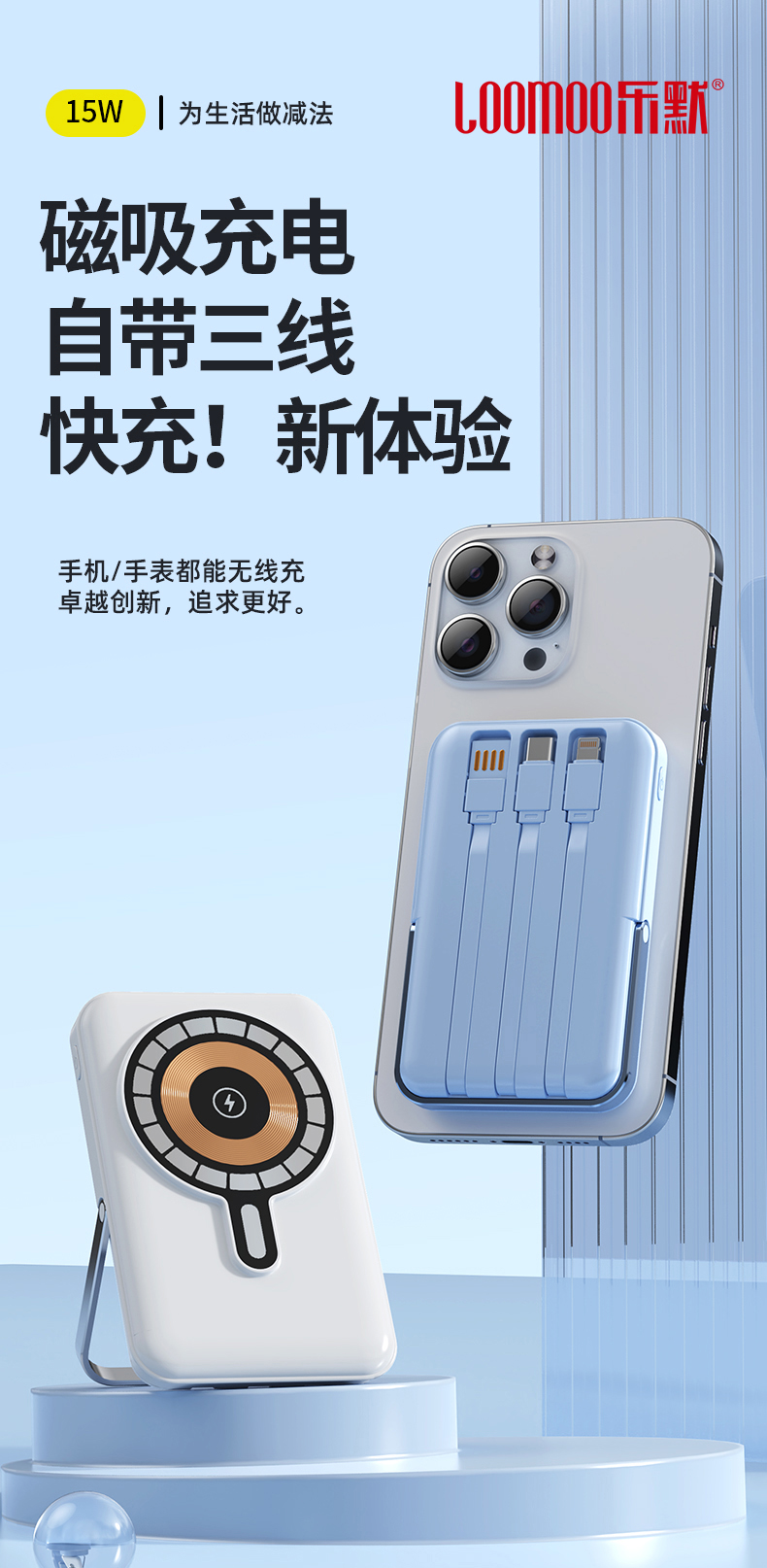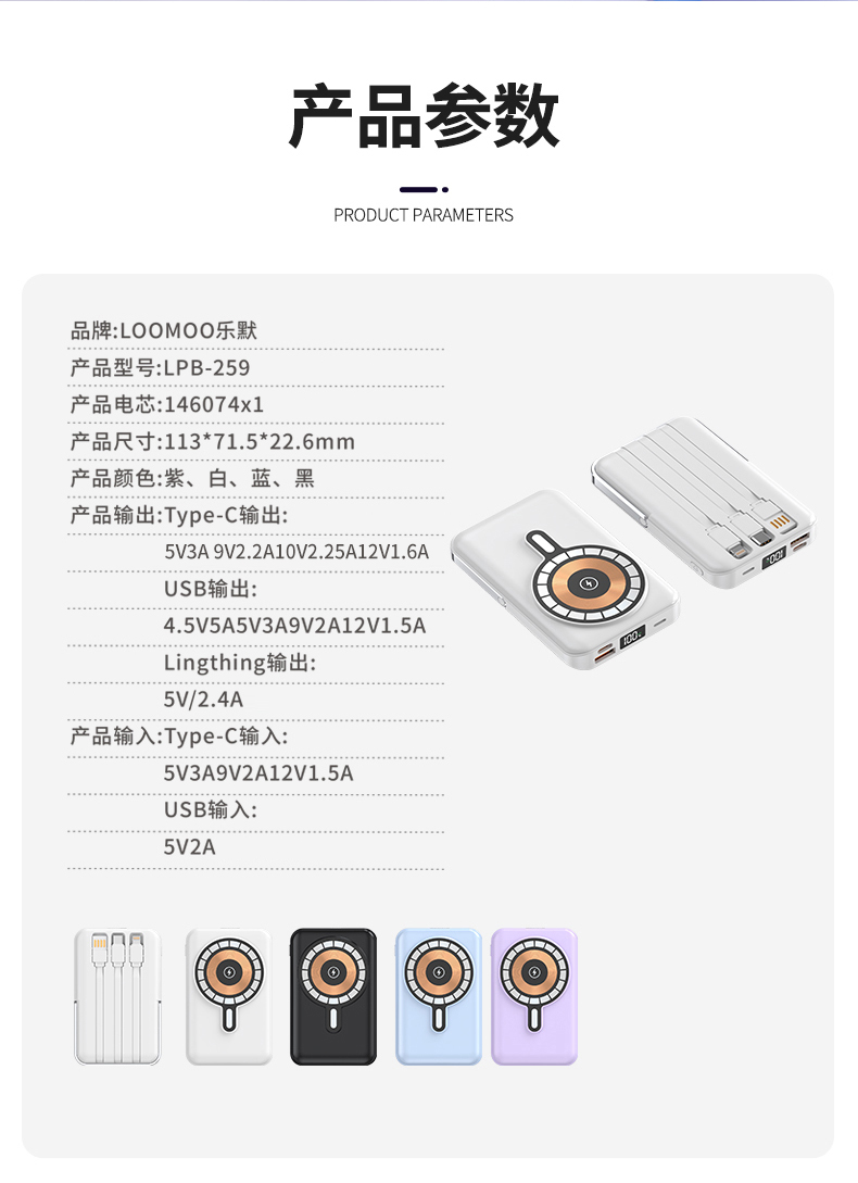 乐默(LOOMOO) 自带三线磁吸快充移动电源 LPB-259 产品尺寸: 113*71.5*22.6mm 蓝色(单位:个)