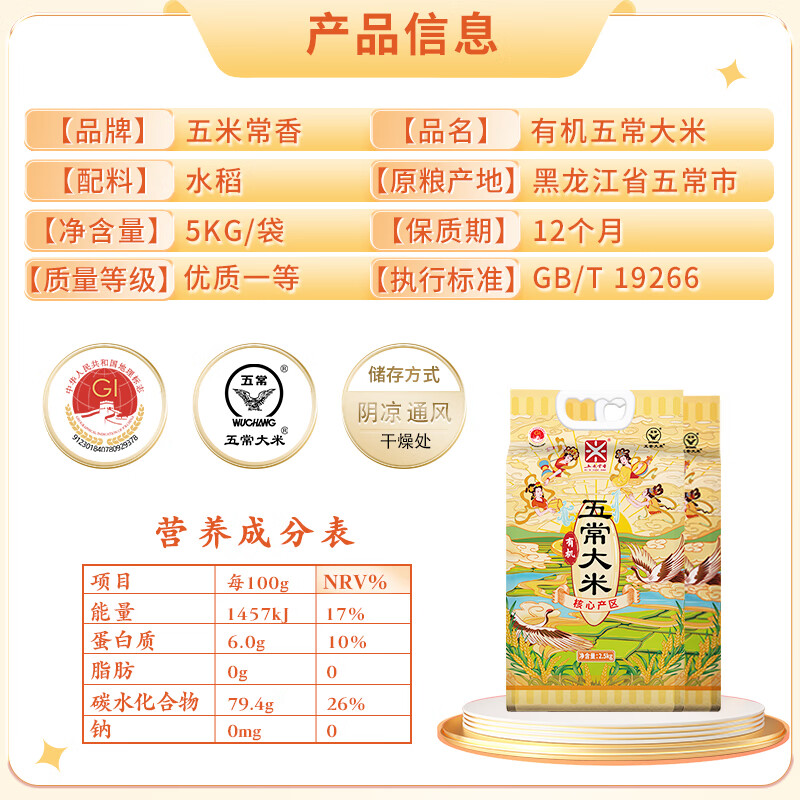 五米常香(WUMICHANGXIANG) 五常有机原粮五常大米 稻花香2号 5kg*1袋 混色(单位:袋)