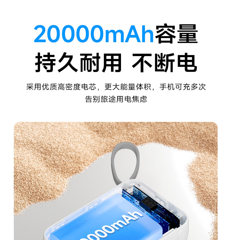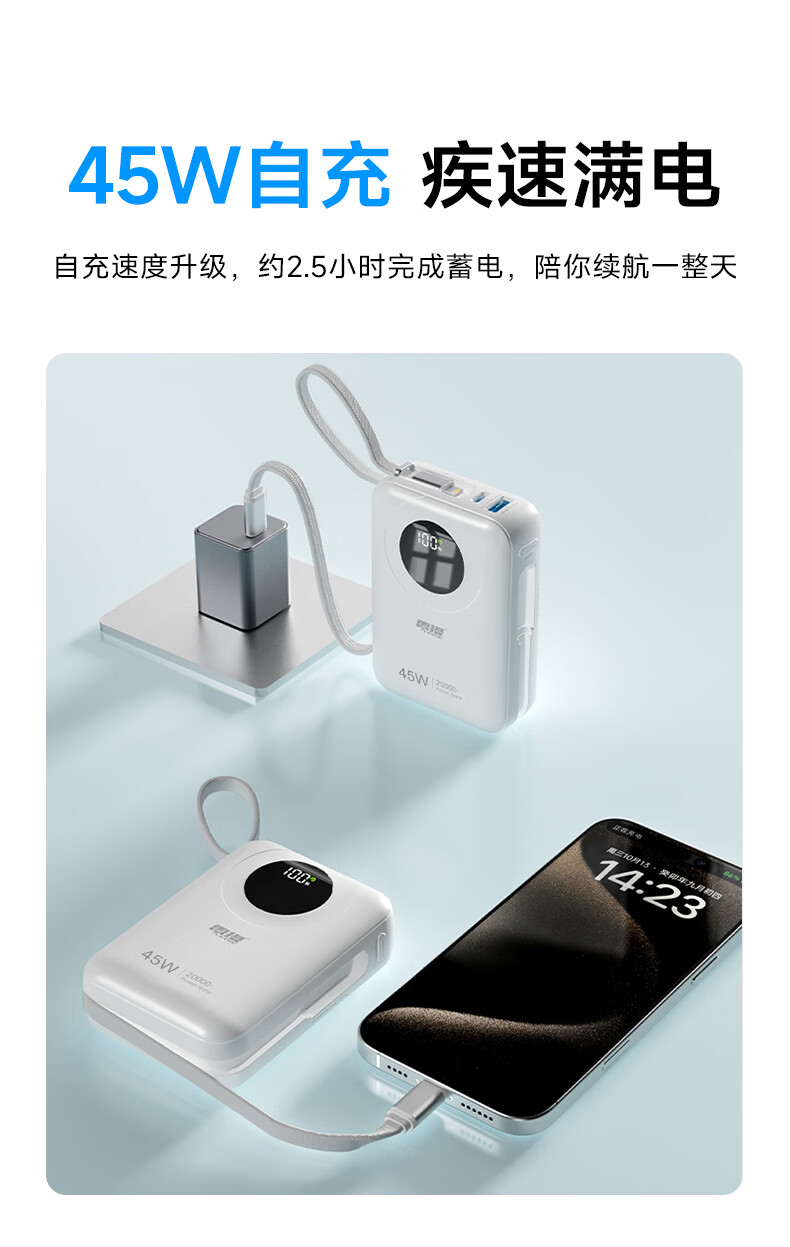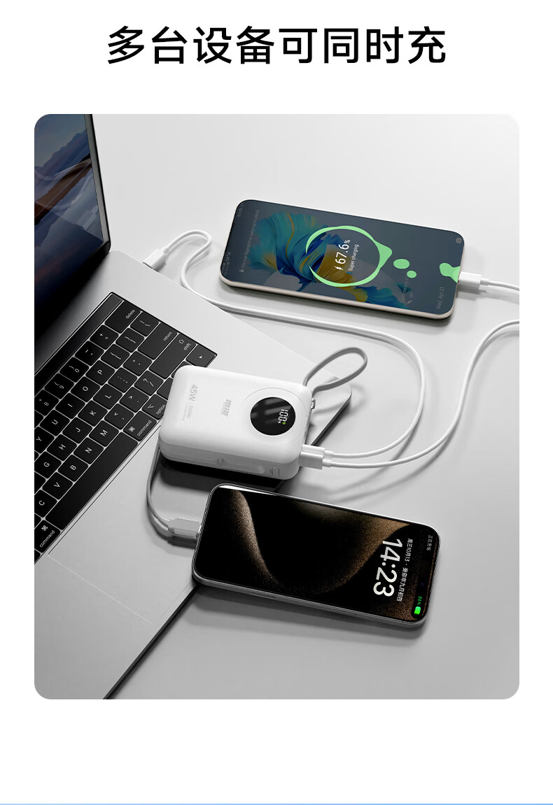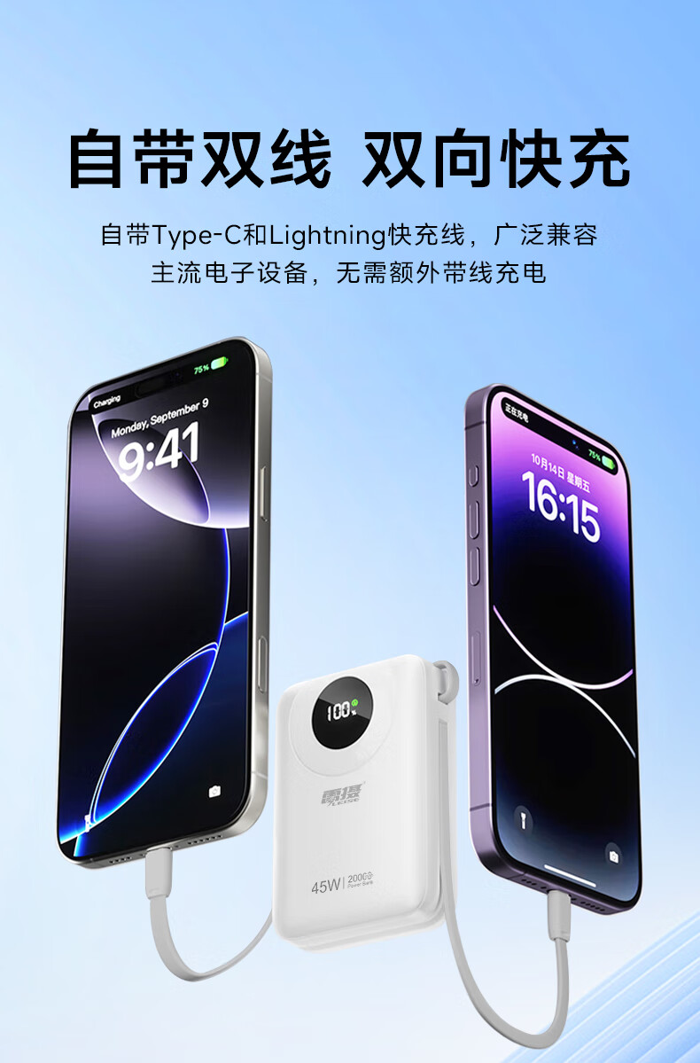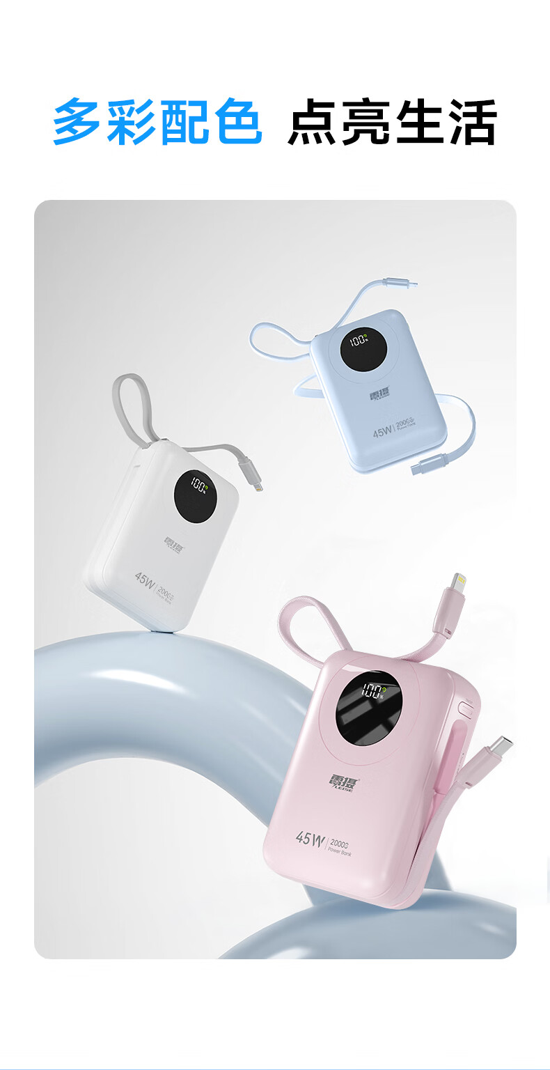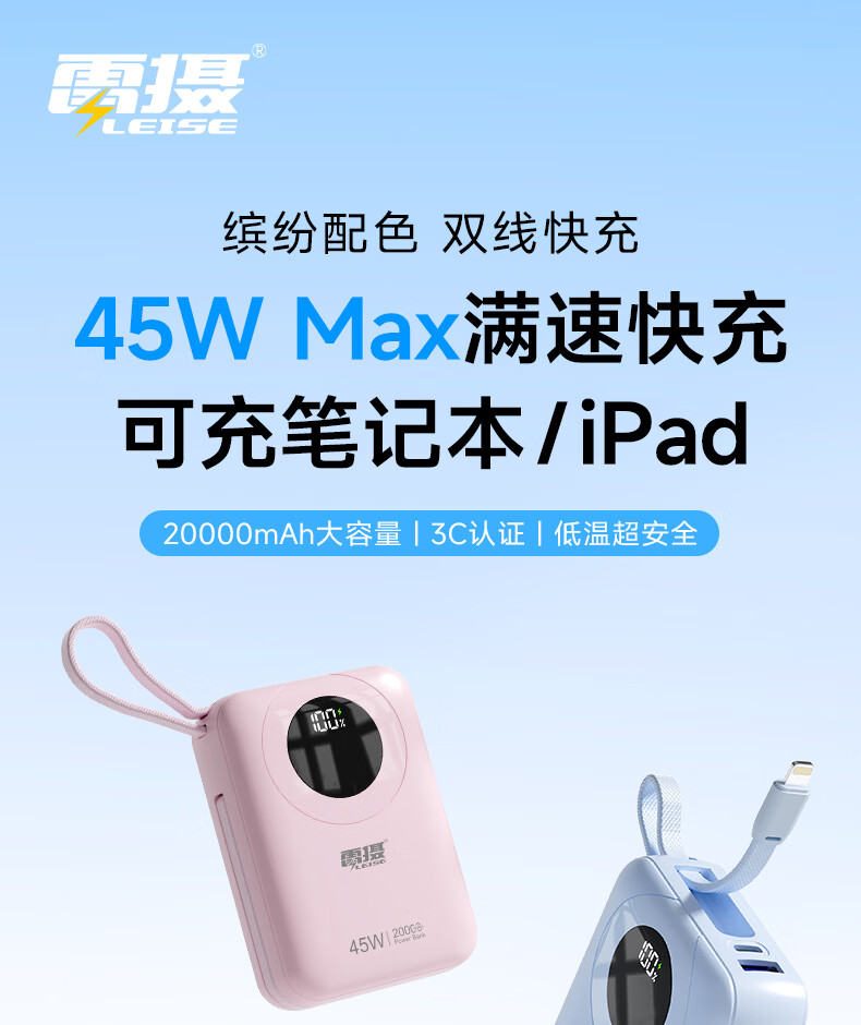 雷摄(LEISE) 移动电源 45W充电宝自带线 移动电源 MH803 20000毫安 白色(单位:个)