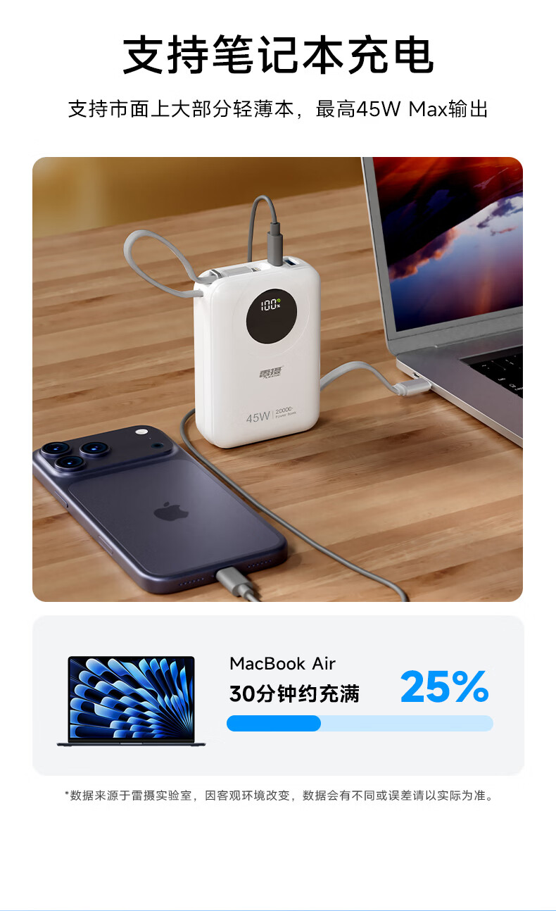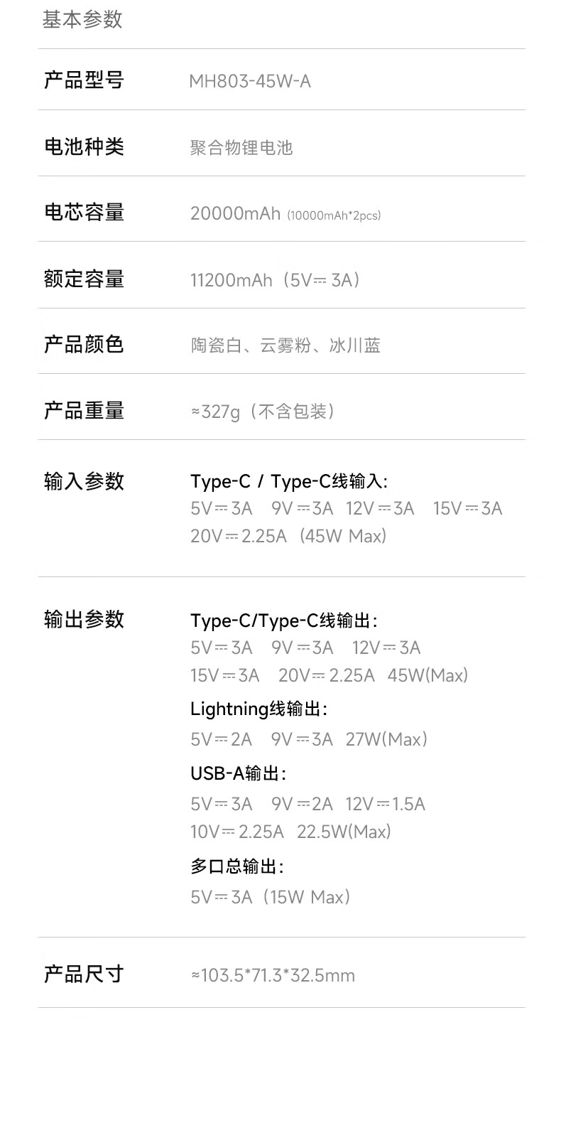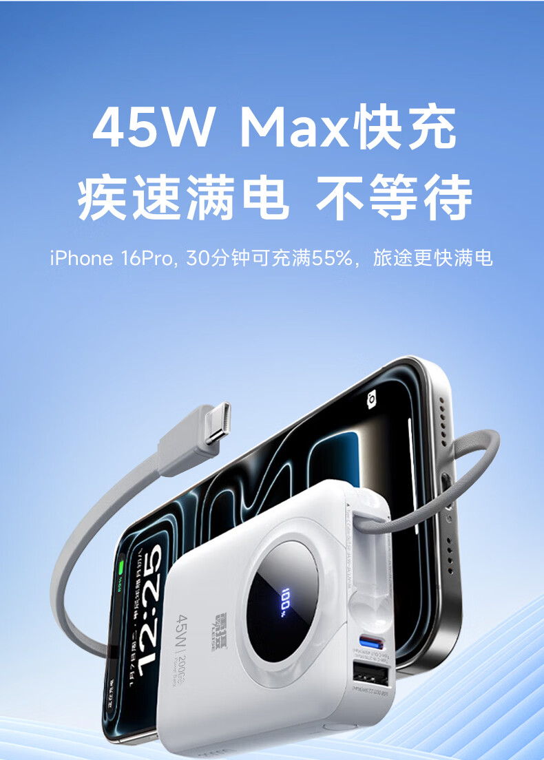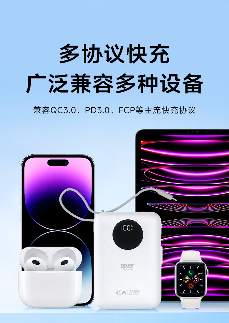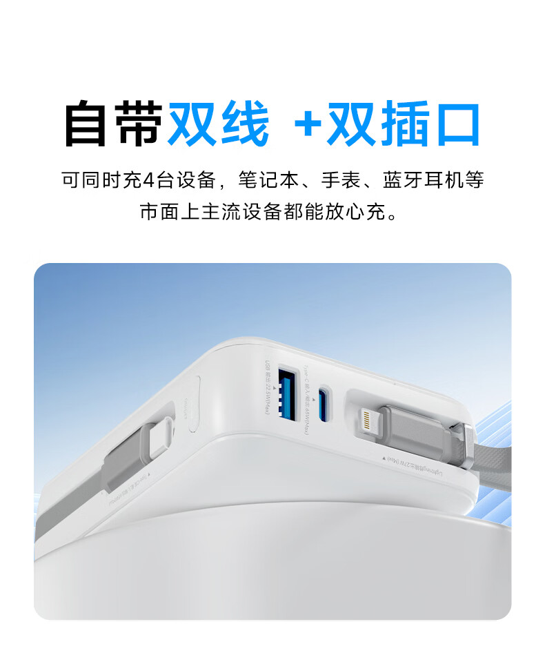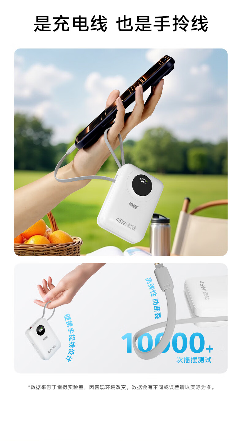 雷摄(LEISE) 移动电源 45W充电宝自带线 移动电源 MH803 20000毫安 白色(单位:个)