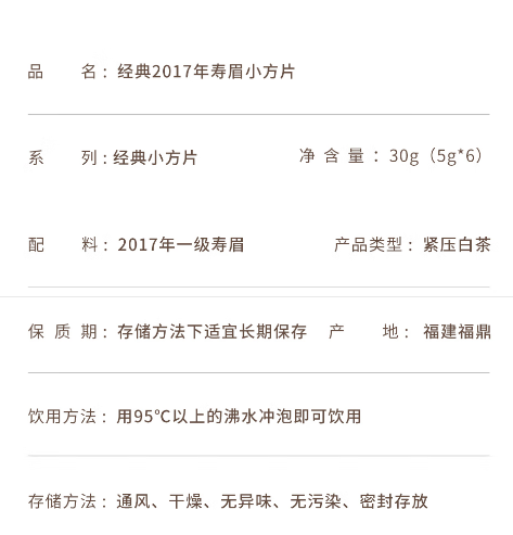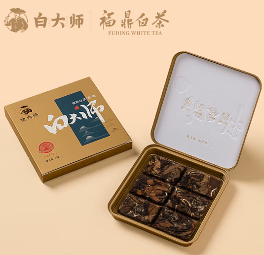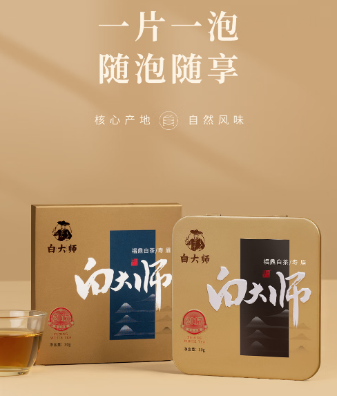白大师茶叶福鼎白茶2017年寿眉小方片饼干茶30g 盒 香槟色