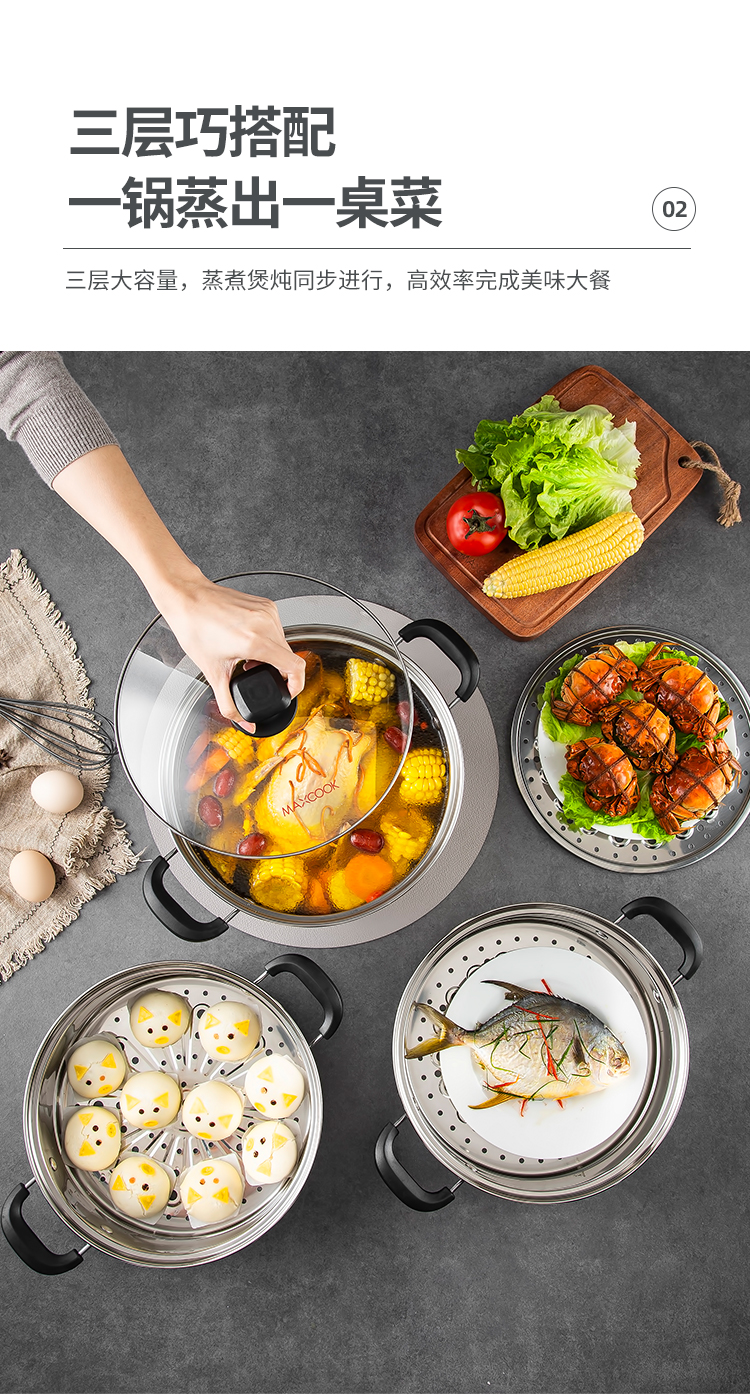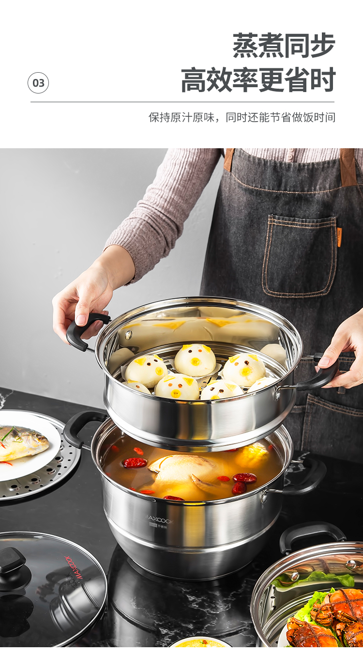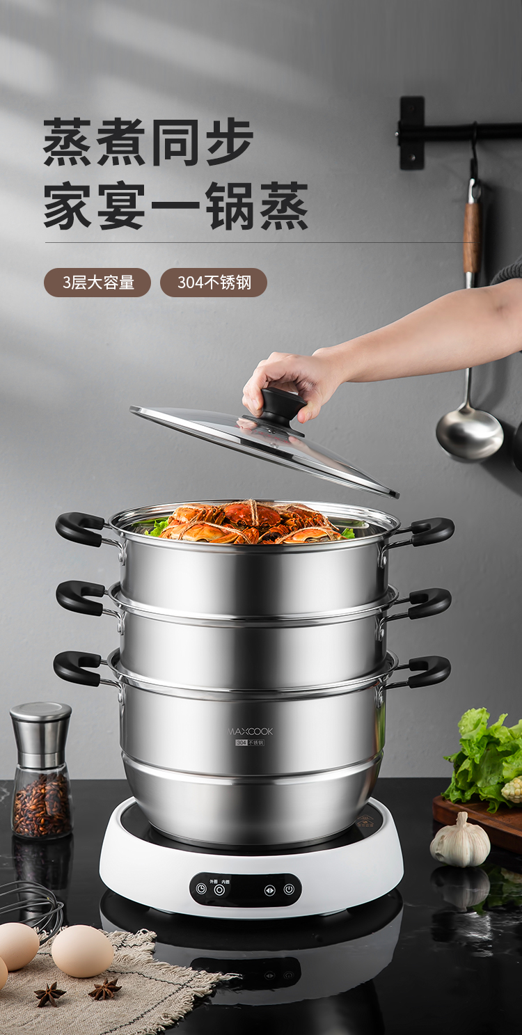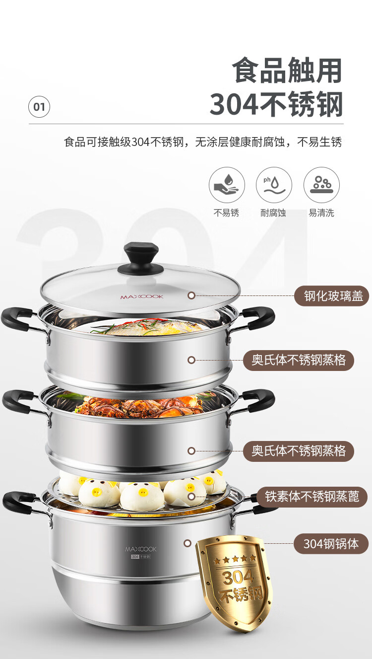 美厨(maxcook)304不锈钢蒸锅 26CM三层复底 燃气炉电磁炉通用MCZ692 不锈钢色