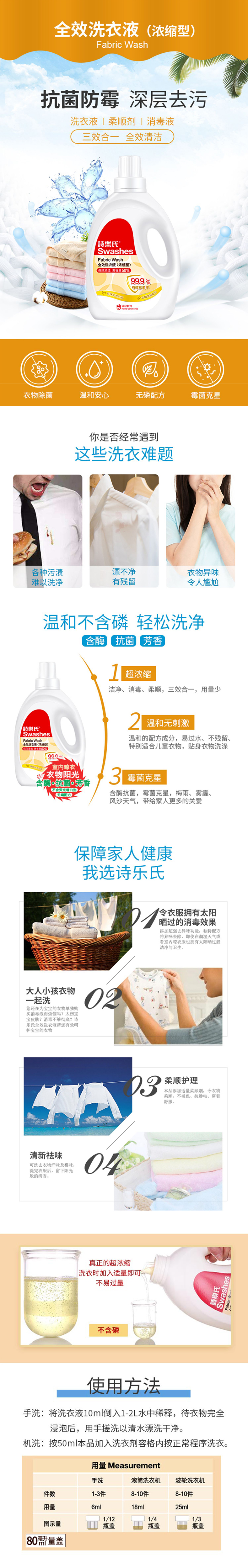 诗乐氏 全效洗衣液瓶装 机洗手洗除菌 易漂洗 浓缩型 不含荧光剂 2L装*2瓶(单位:瓶) 浅黄色