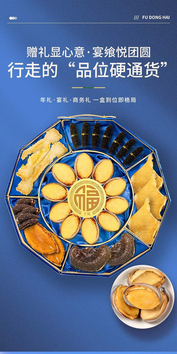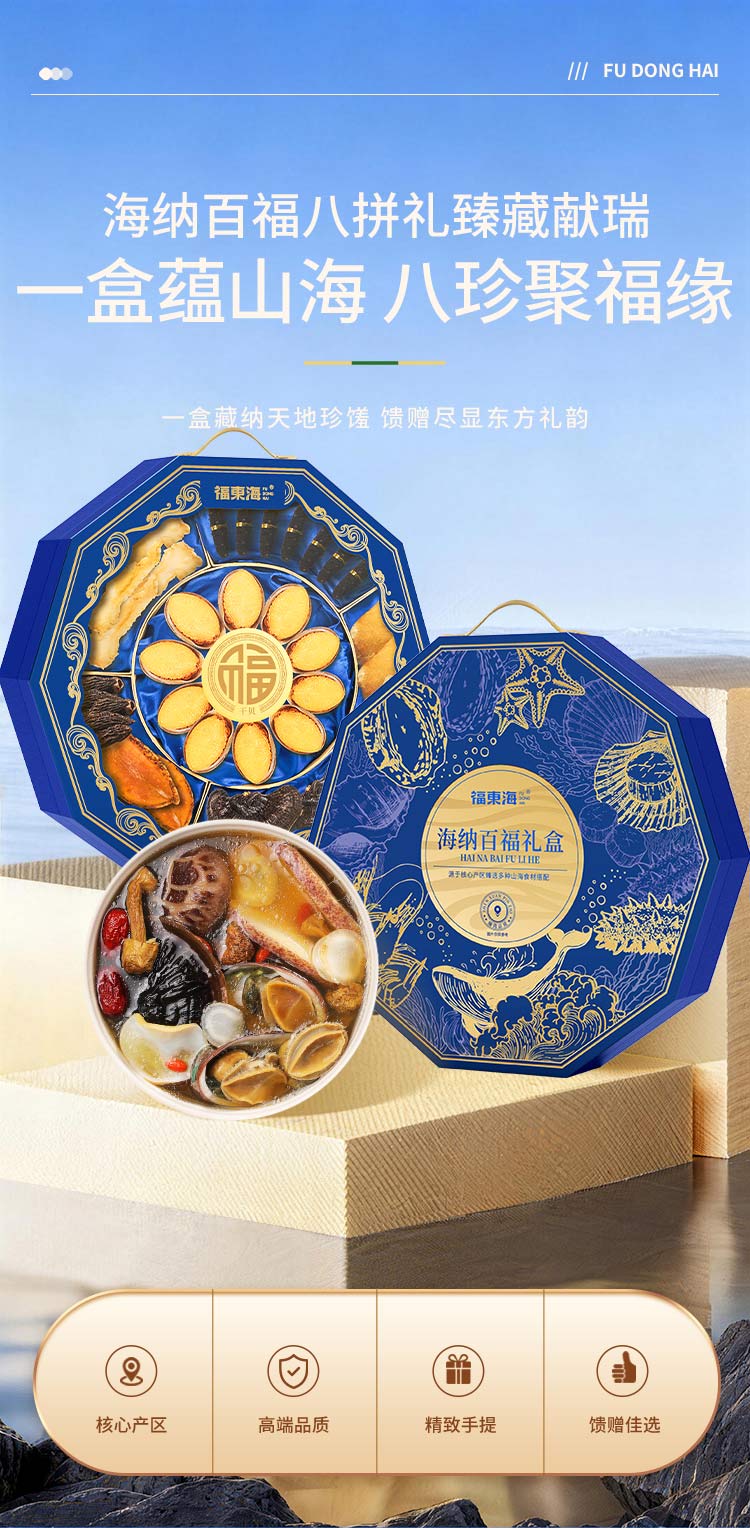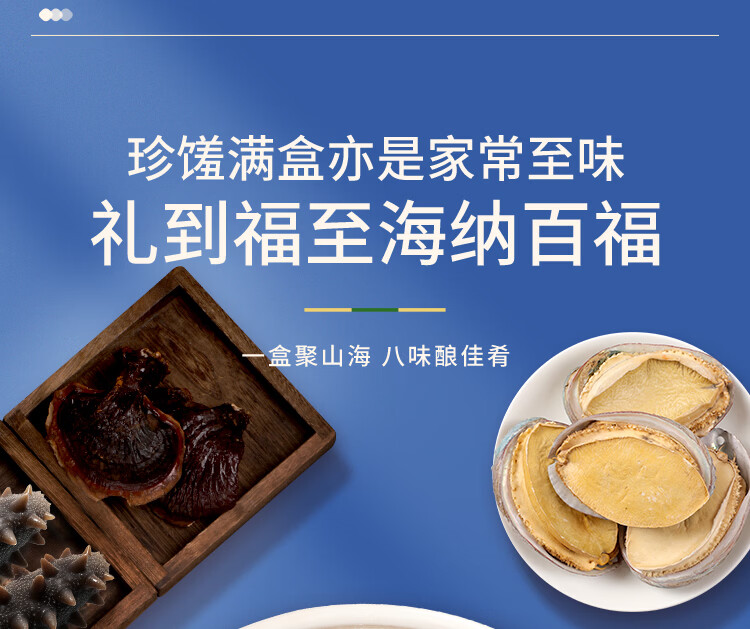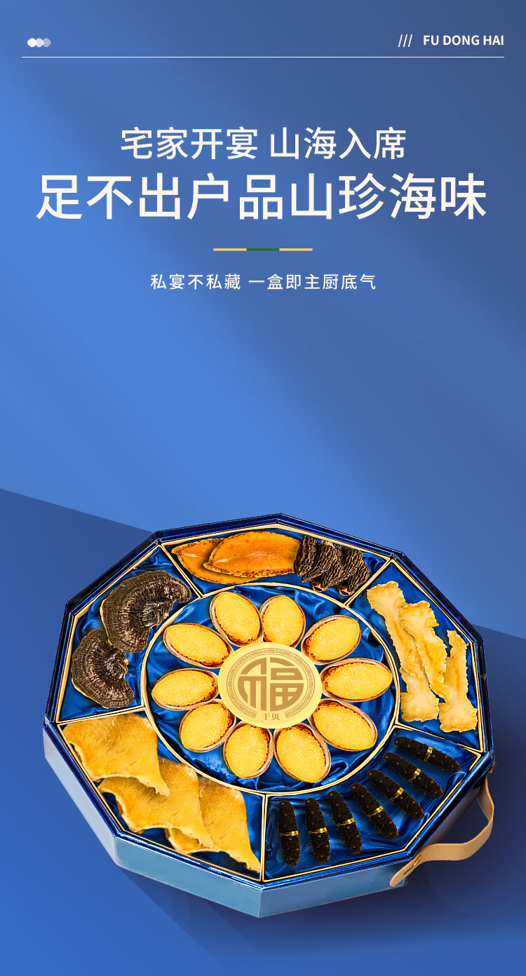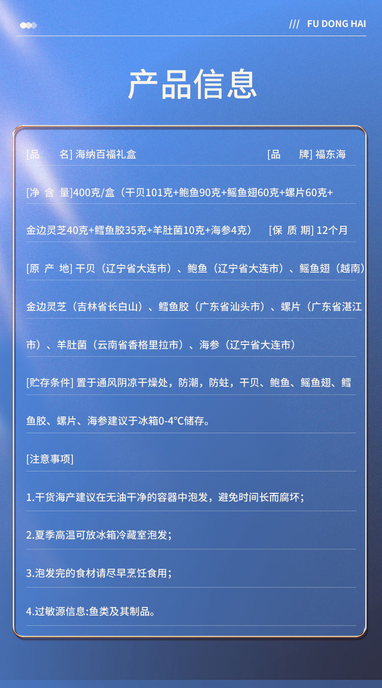 福东海(fudonghai) 干贝鲍鱼鳐鱼翅螺片灵芝鳕鱼胶羊肚菌 海参海纳百福礼盒 400克 蓝色(单位:盒)