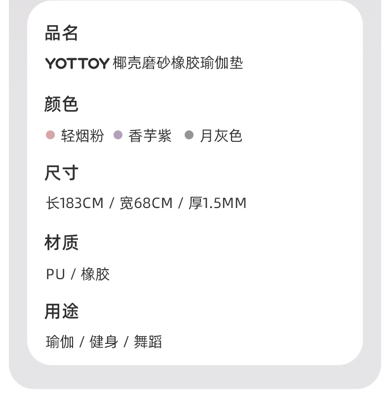 YOTTOY 68纯净系列椰壳橡胶瑜伽垫 yjdx2407x1A00018701i001 183*68*0.15cm 灰色(单位:条)