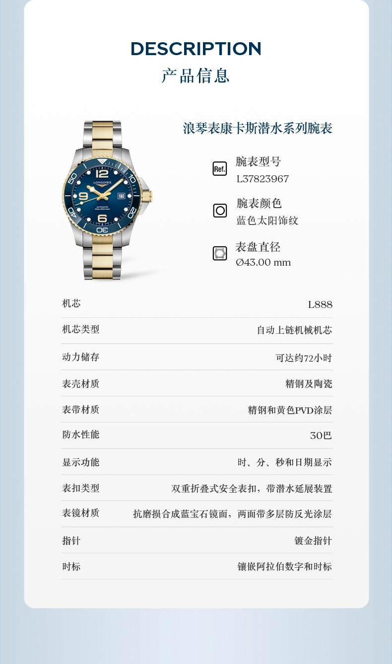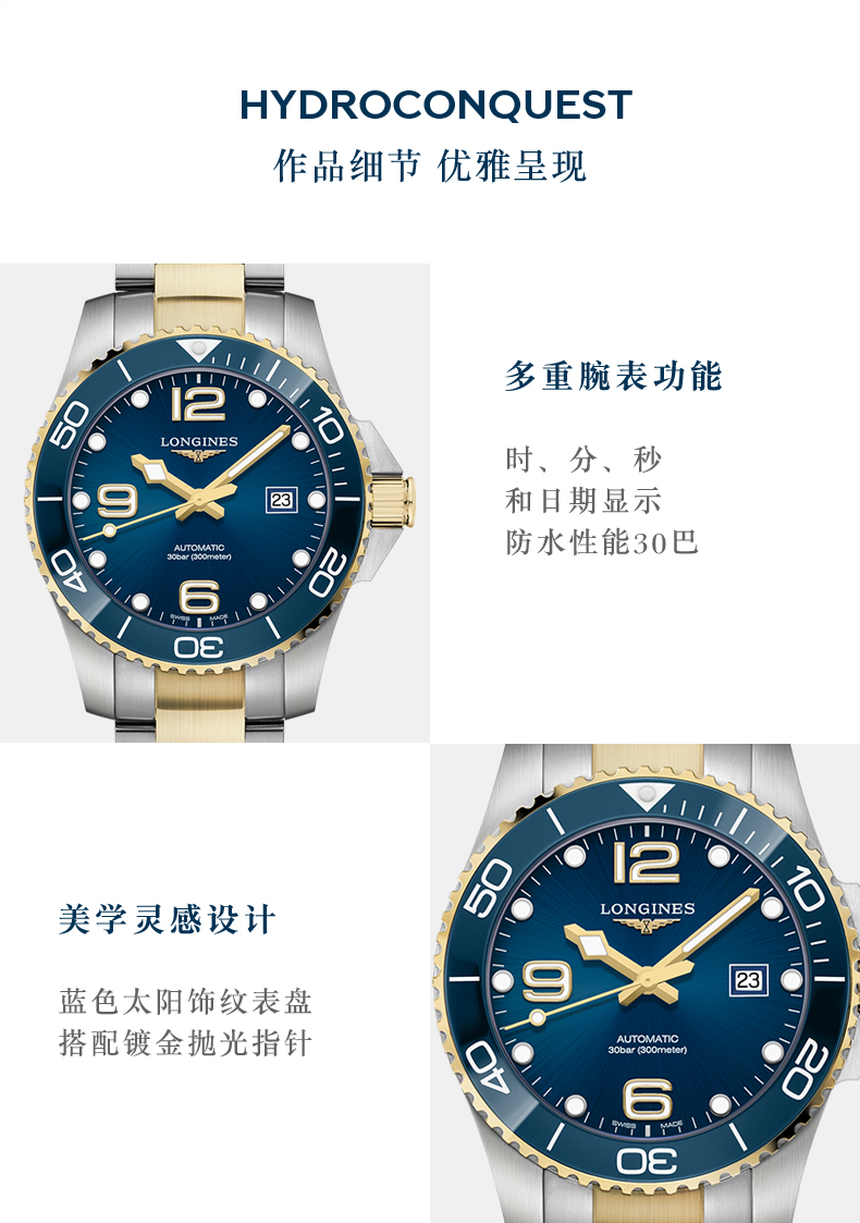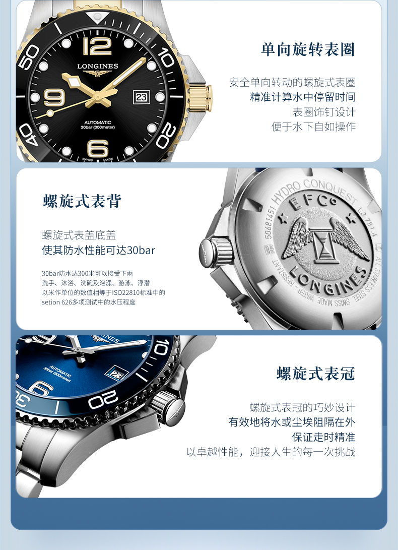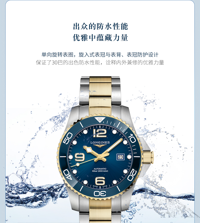 浪琴Longines瑞士手表 康卡斯潜水系列机械钢带男表L3.782.3.06.7 绿色哑光43.0 绿色