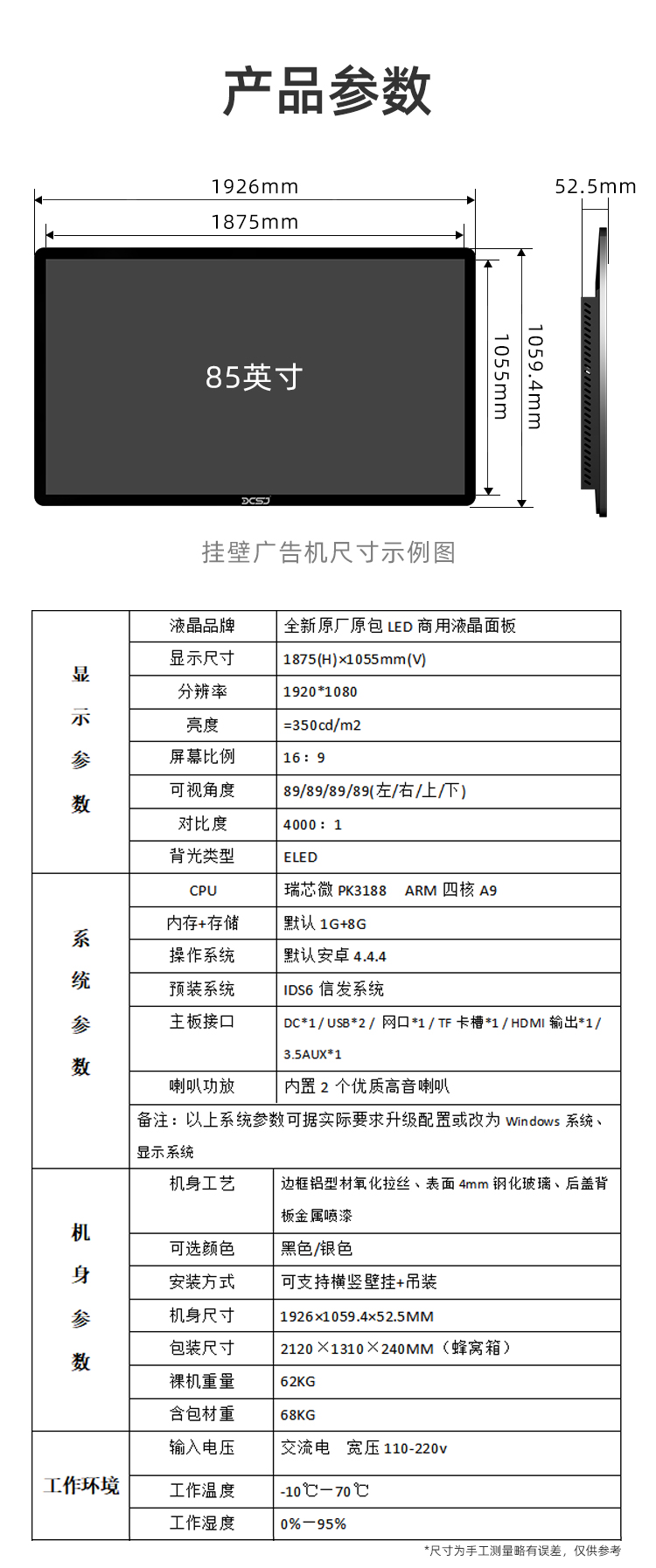 鼎创视界 85英寸壁挂广告机 商场酒店楼宇宣传广告牌 DC-BGGGJA85DJSX 62KG/350ml 黑色(单位:台)