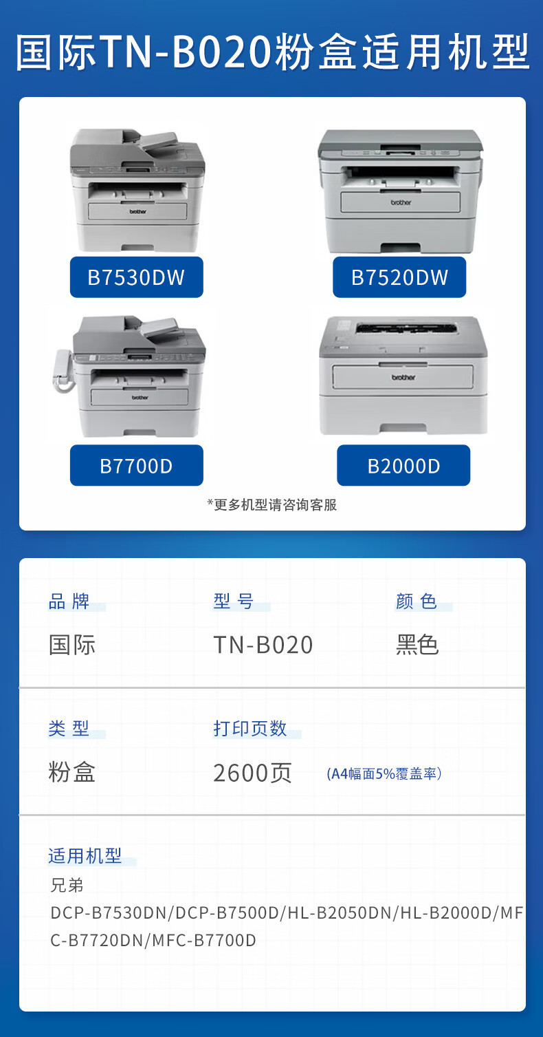 国际 TN-B020 打印量约2600页 适用DCP-B7530DN/7500DHL-B2050DN/B2000DMFC-B7720DN/B7700D 硒鼓 1.00 只/支 (计价单位:支) 黑色