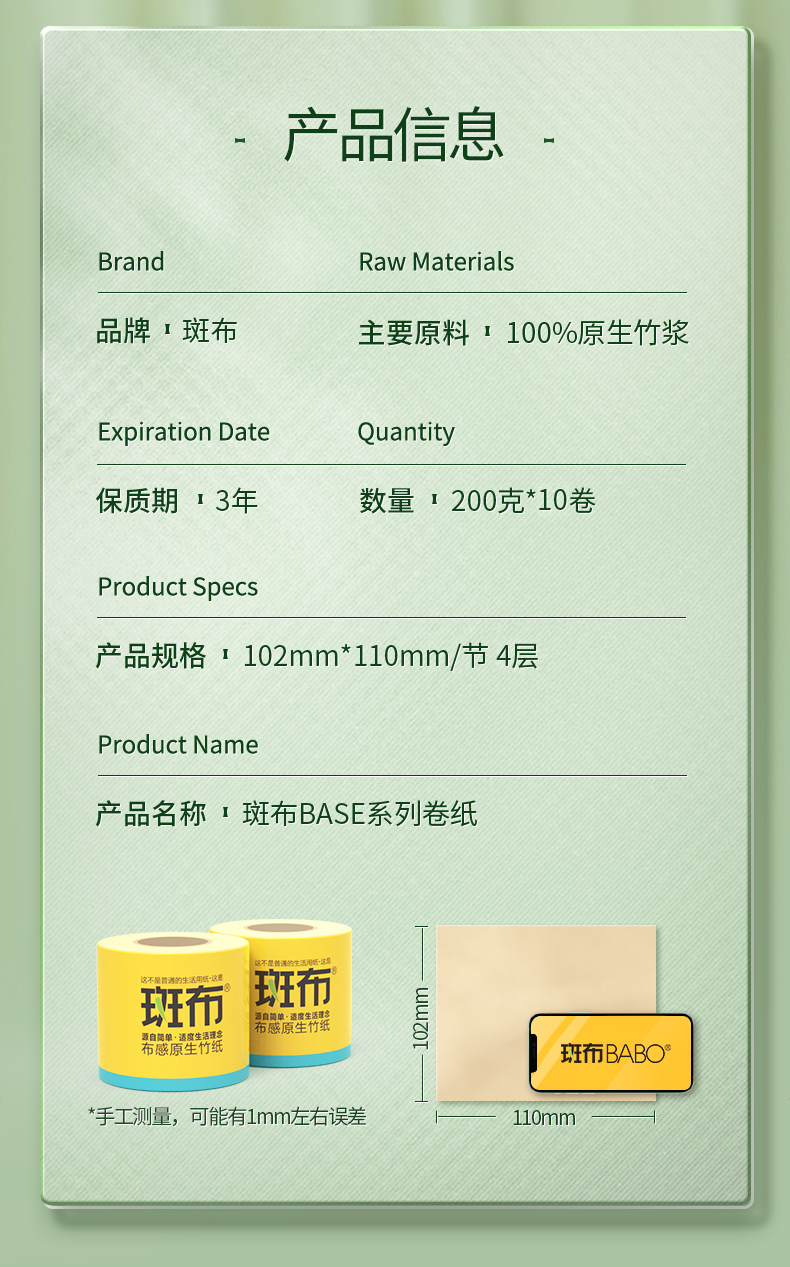 斑布(BABO)BASE系列有芯有膜卷纸 原生竹浆本色 200克10卷BCJ200A10(单位:提) 本色