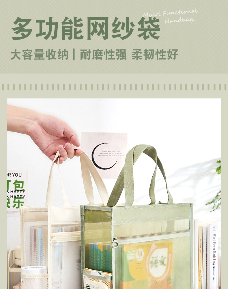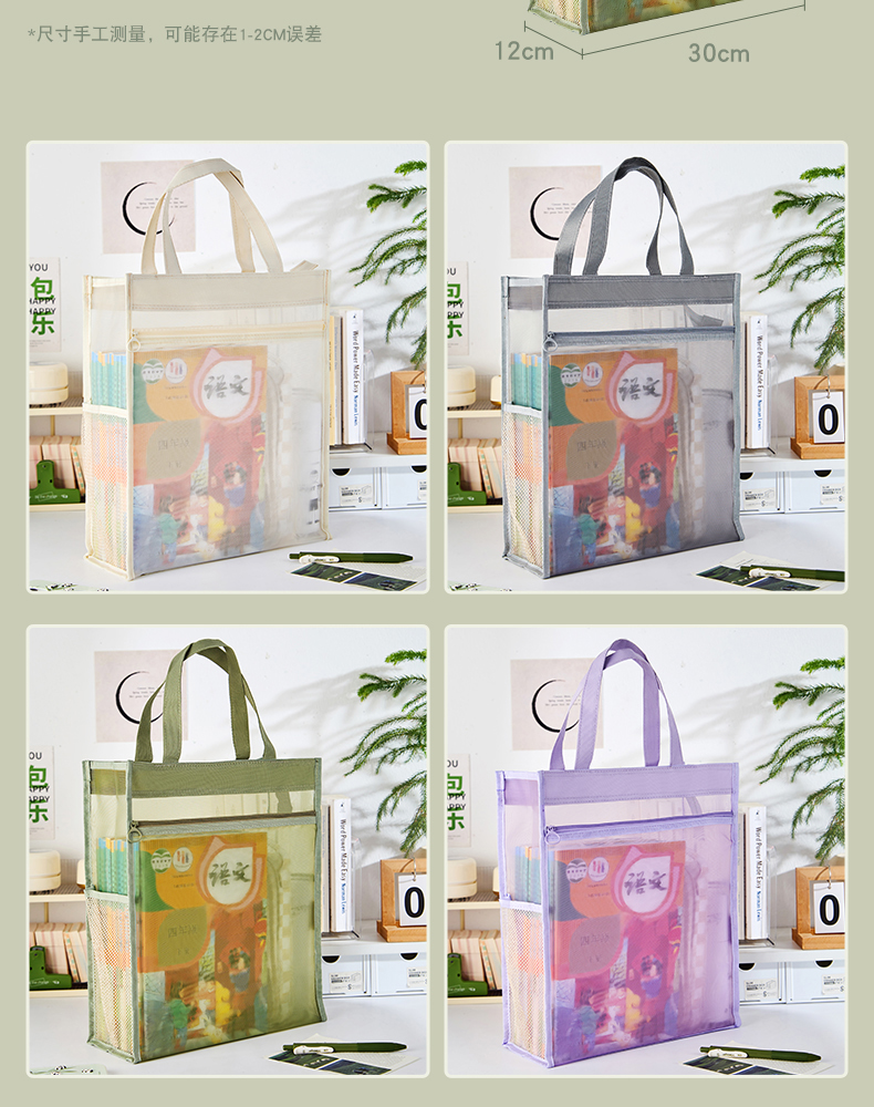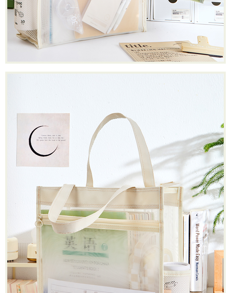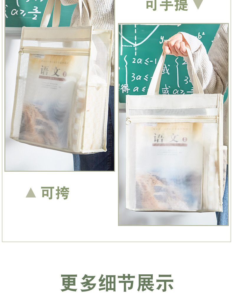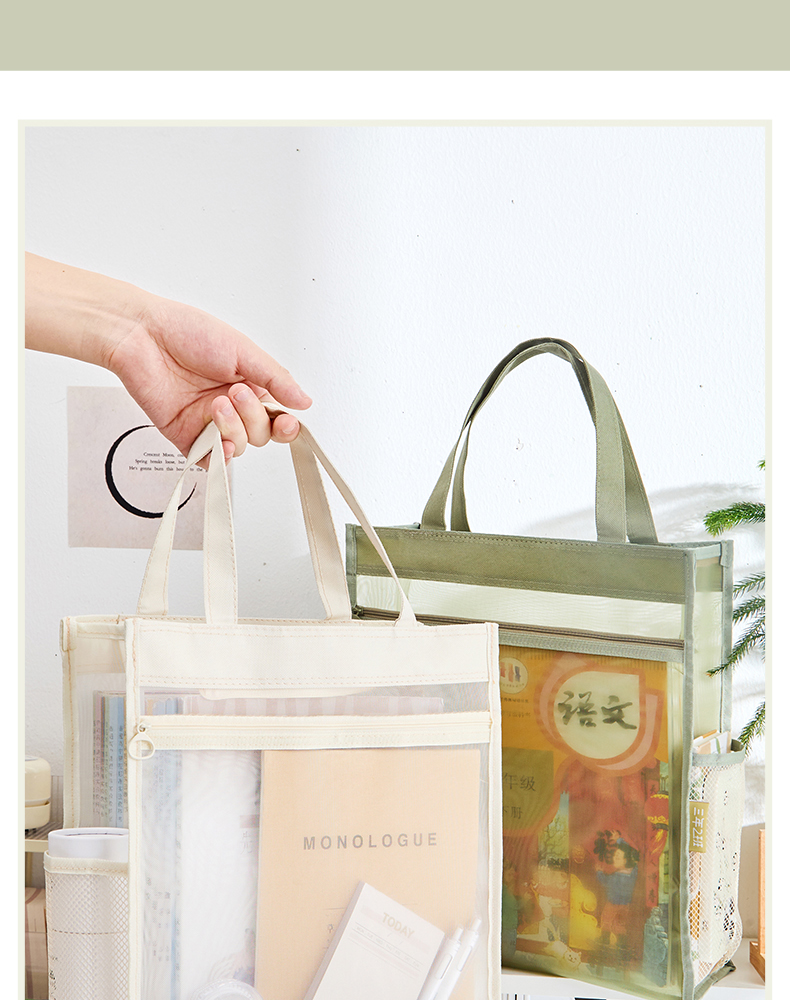 三年二班透明网纱手提补习袋学生用简约拎书袋作业文件袋补课袋双层大容量收纳袋儿童书包/个 云白
