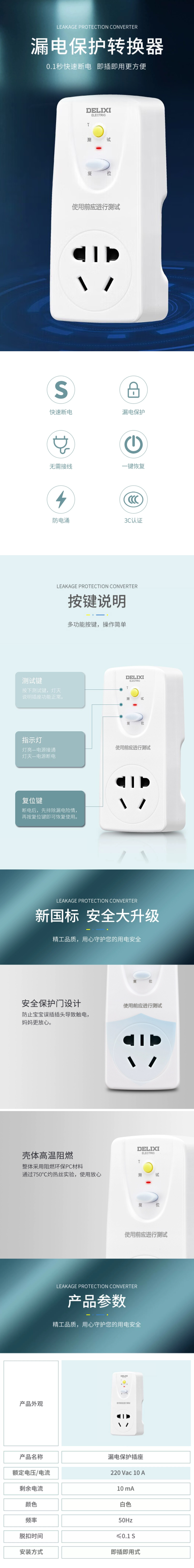 德力西电气漏电保护插座10A直插转10A一位五孔 HD-LBTZS 白色