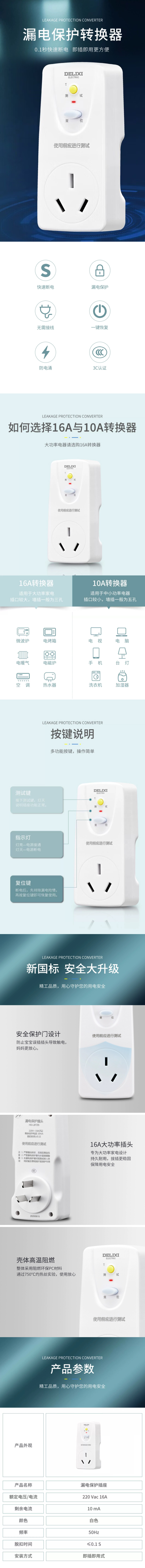 德力西电气漏电保护插座16A直插转16A一位三孔 HD-LBTS16 白色