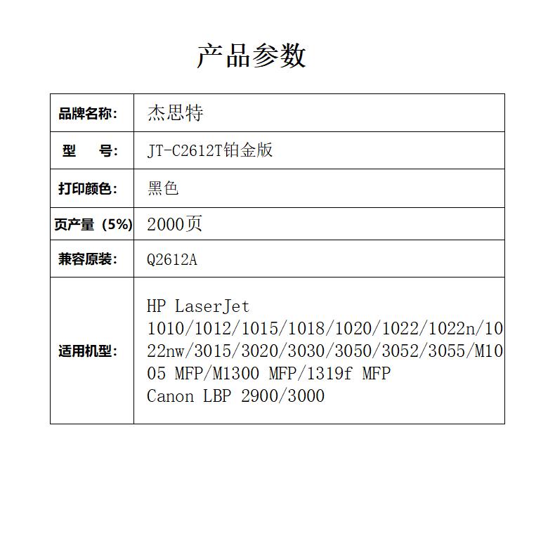 杰思特12A硒鼓JT-C2612T铂金版易加粉适用惠普10051020plus101030151支装 黑色