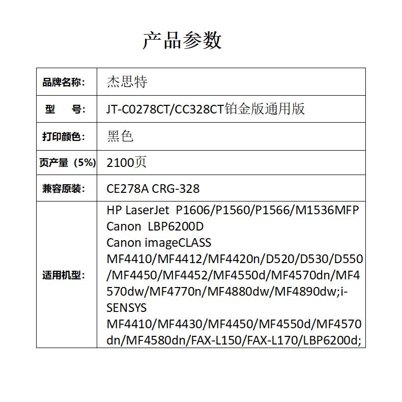 杰思特JT-C0278CT/CC328CT铂金版通用版硒鼓适用佳能MF4570 4752 1支装 黑色