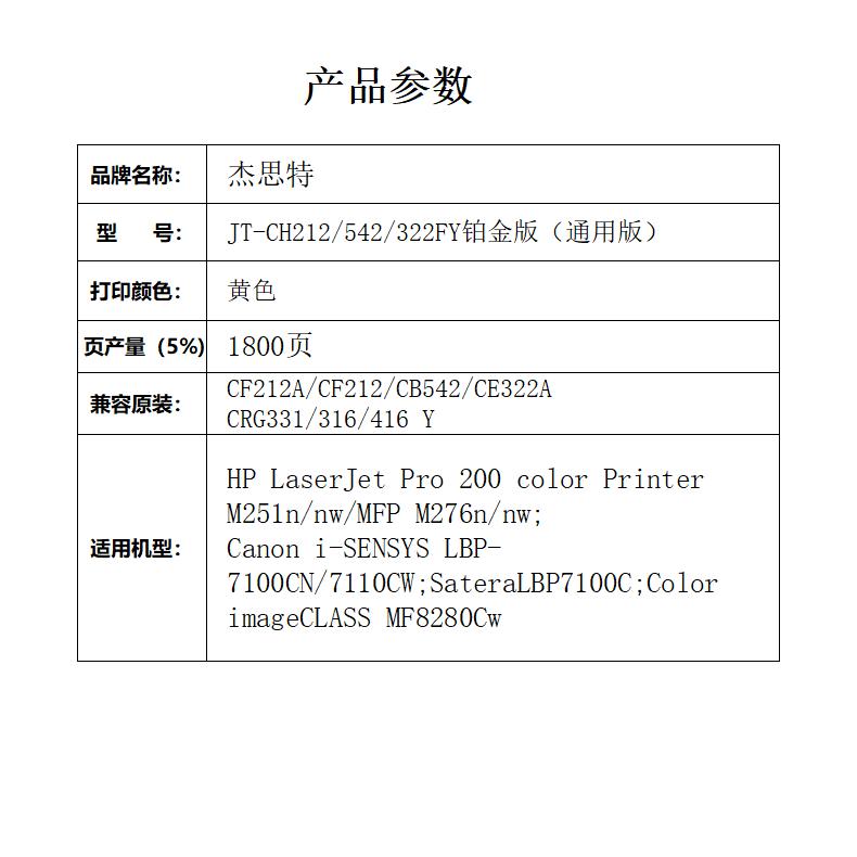 杰思特JT-CH212/542/322FY铂金版适用惠普M251n/nw/MFP/CP1215 支 黄色