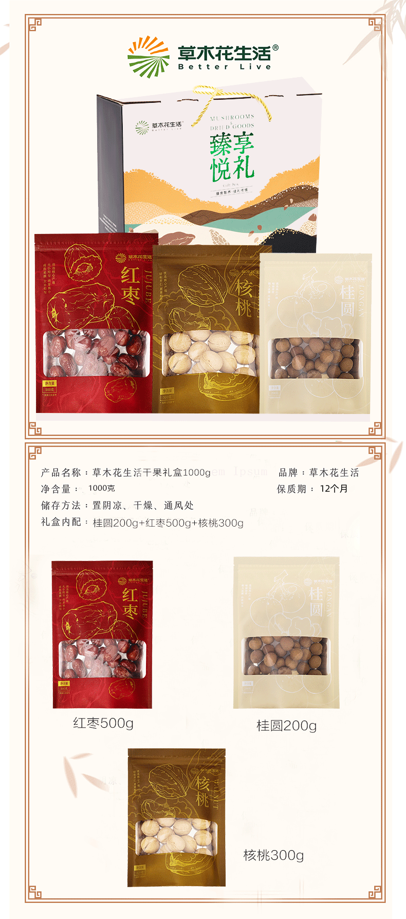 草木花生活 干果礼盒 天然农产营养丰富 1000g 白色(单位:盒)