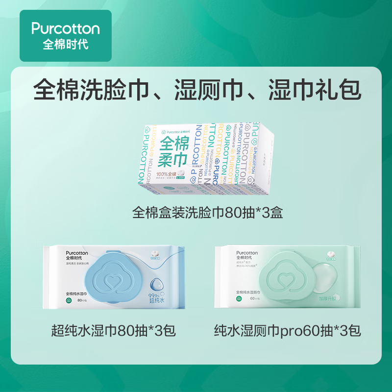 全棉时代 20250304(组合) 洗脸巾3盒+湿厕巾3包+湿巾3包 全家桶 绿色(单位:套)