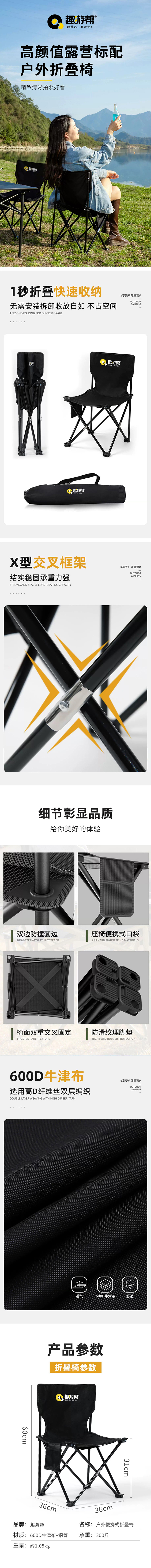 趣游帮 Y07-plus 60*36*36cm 中号户外折叠椅 曜石黑(单位:把)
